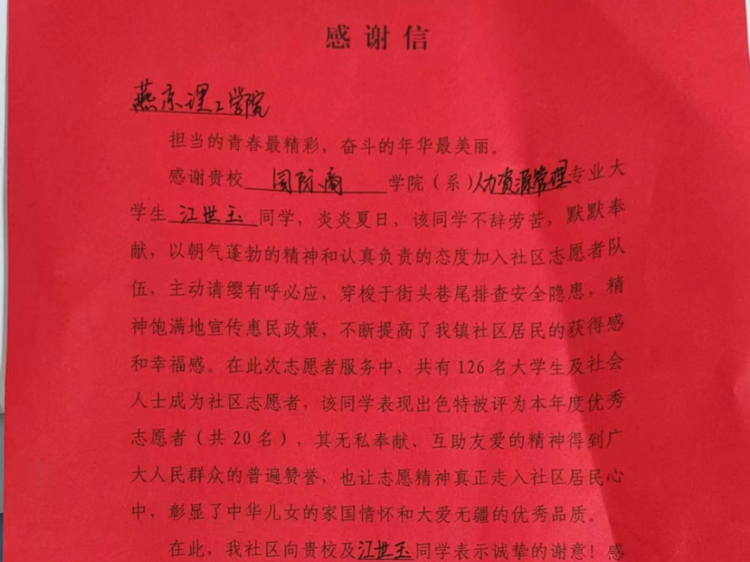 近日,一封由中共赵县赵州镇社区委员会寄来的表扬信送至燕京理工学院,信中赞扬了国际商学院人力资源管理专业的江世玉同学利用假期时间积极参与社区志愿活动,用实际行动诠释了“奉献、友爱、互助、进步”的志愿者服务精神,充分展现了一名优秀青年的风采。
