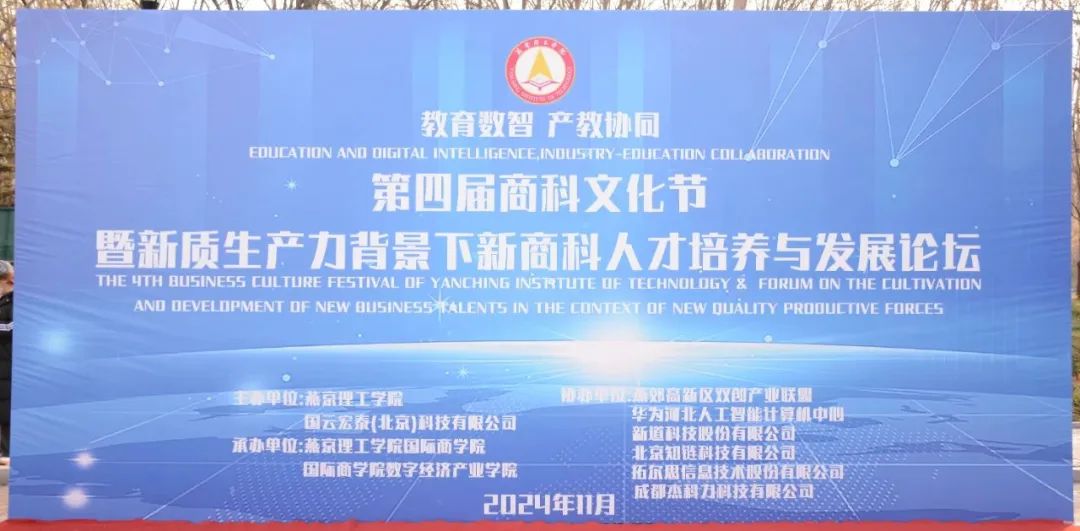 为凝聚人才培养智慧,促进新商科人才建设,培养能够适应新质生产力背景下的高素质、应用型商科人才,11月28日、29日,燕京理工学院举办以“教育数智,产教协同”为主题的第四届商科文化节暨新质生产力背景下新商科人才培养与发展论坛。此次论坛由燕京理工学院与国云宏泰(北京)科技有限公司主办,燕京理工学院国际商学院、数字经济产业学院承办,并由燕郊高新区双创产业联盟、华为河北人工智能计算机中心、新道科技股份有限公司、北京知链科技有限公司、拓尔思信息技术股份有限公司、成都杰科力科技有限公司共同协办。