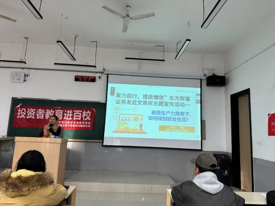 韩丽总经理在金融学专业平行会场中作题为《新质生产力背景下,如何规划职业生涯?》的专题报告。韩丽经理指出,在新质生产力背景下,金融学专业的学生需要深刻理解技术革命性突破、生产要素创新性配置、产业深度转型升级对职业发展的影响。她强调,新质生产力时代要求金融从业者不仅要掌握传统金融知识,还要具备数字经济、人工智能等新兴技术领域的知识和技能,以适应快速变化的金融环境。同时她并建议同学们关注行业发展趋势,提升个人竞争力,以实现职业生涯的长远发展。