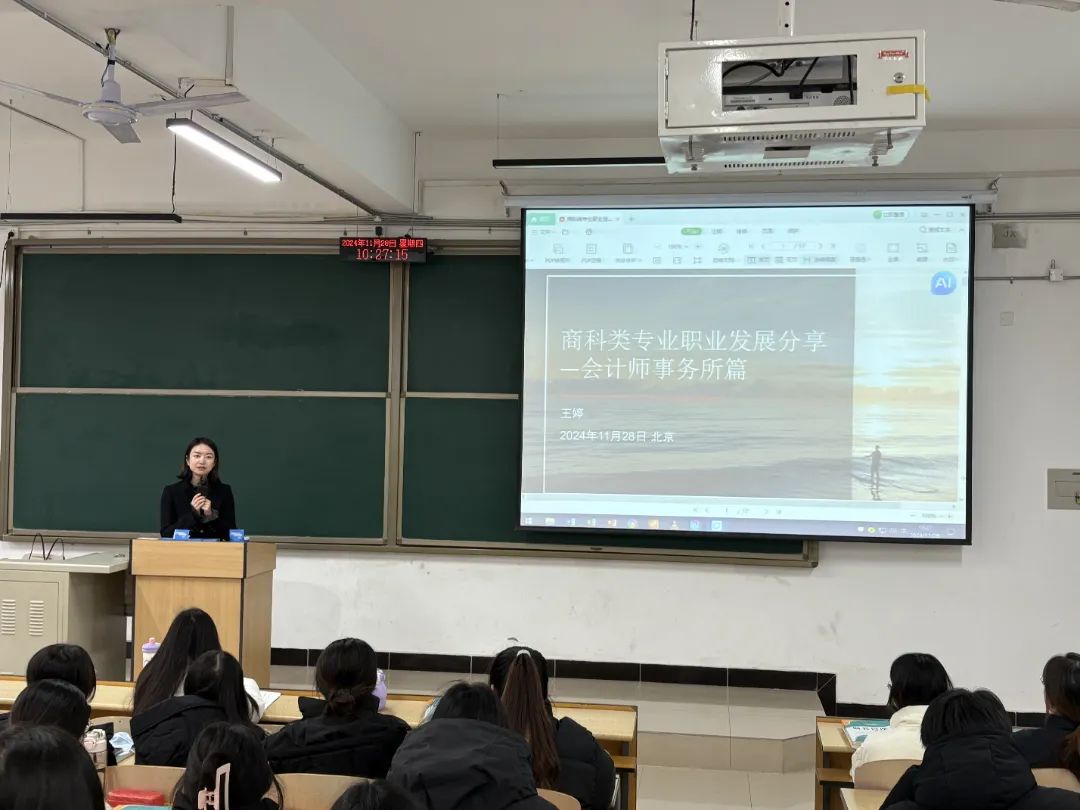 财务管理专业平行会场中,普华永道中天会计师事务所高级经理王婷从审计行业现状和未来发展、职业发展中需要培养的软实力、财务领域知名证书等多个方面讲述了《商科类专业职业发展分享——会计师事务所篇》的专题报告。王婷经理表示,在未来的职业发展中,同学们可以考取各类相关职业证书,参加各类学科竞赛,保持终身学习的能力。