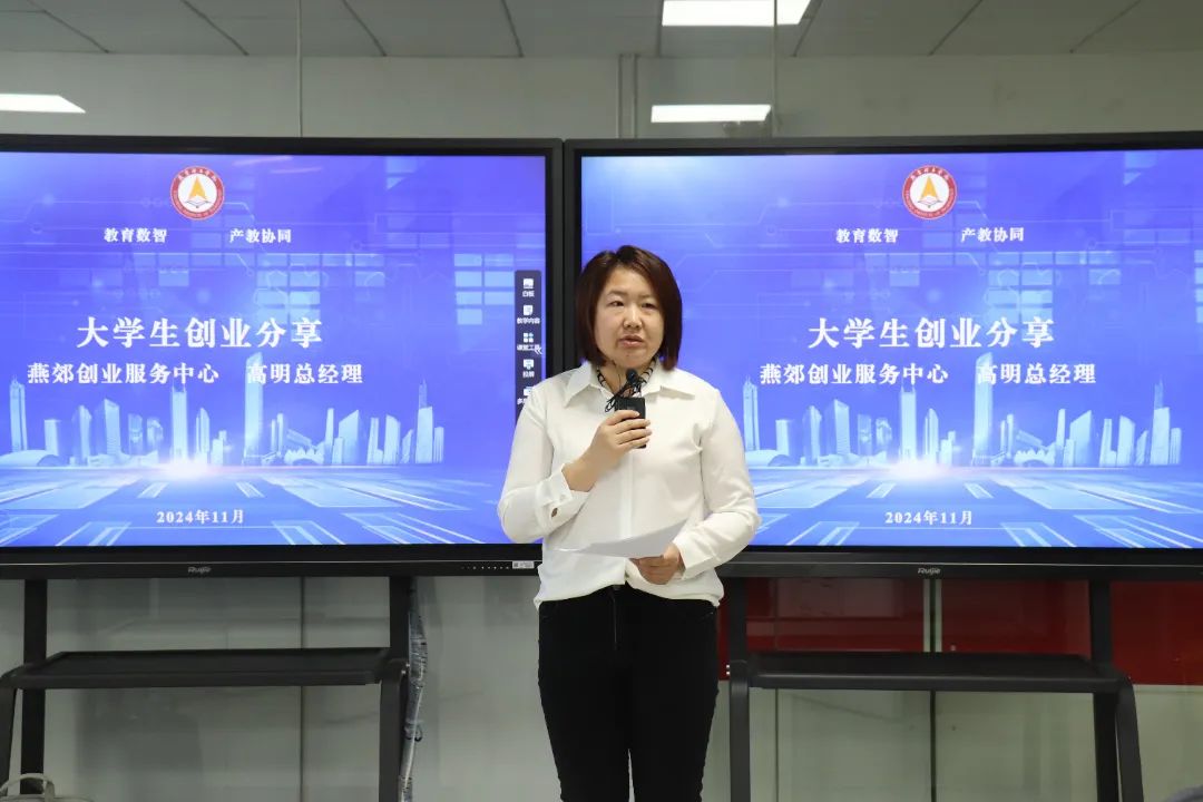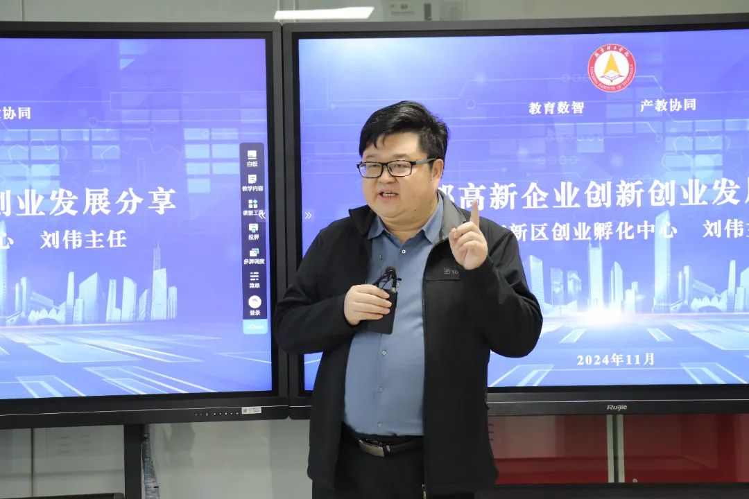 刘伟主任做关于《燕郊高新企业创新创业发展的分享》。当今时代商业环境紧张,国际形势严峻,创新创业面临着困难,刘主任表示,数字化转型是当前的风口,数字化、智能化是更是国家的重点关注,学院应该抓住机会选择正确的方向,进行数字化教育,培养学院学生的创新能力。