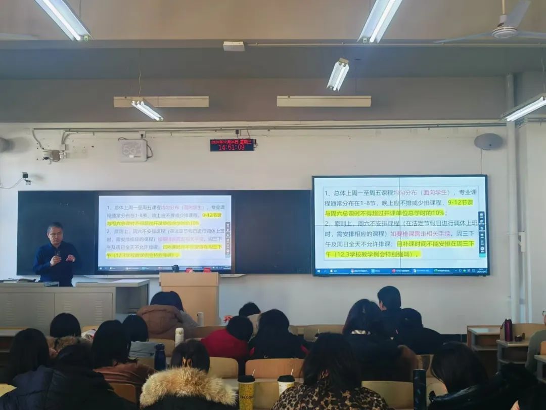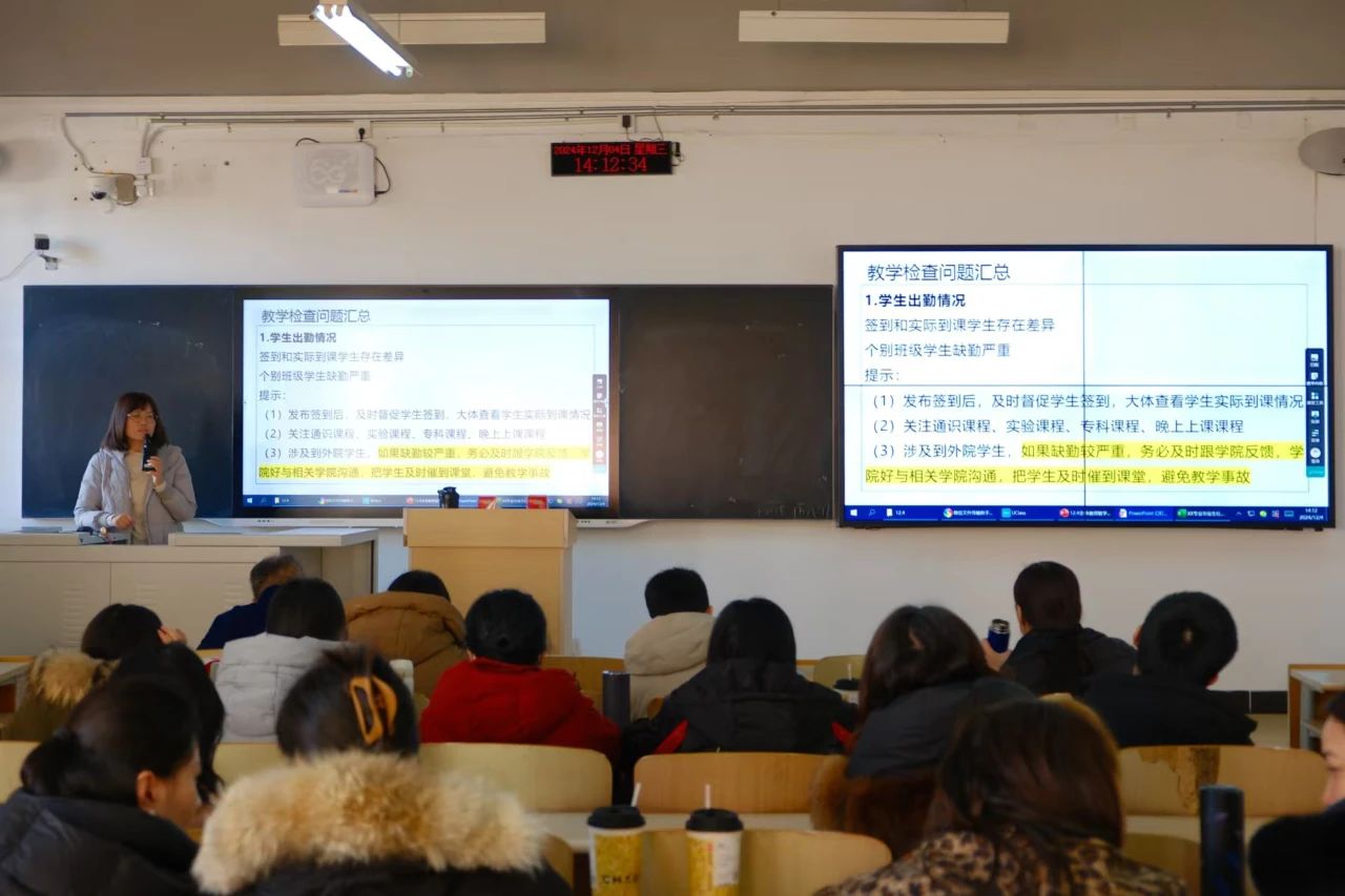 张琪副院长就2024年教学工作内容进行总结,深度剖析了学院教育教学工作目前存在相关问题。张院长指出,近期的教学工作中,学生的听课状态及学习质量仍有待提升,希望学院教师予以重视,注重教学方式的变革,提升学生的综合素质能力。张院长向教师们展示了2025届学生毕业论文的工作进度,并从社会调研、毕业实习、毕业论文、指导日志四个方面作出具体指导。临近期末,张院长强调老师们在期末考试中应真实、公平地对待学生的考试结果及最终成绩。此外,张院长向各位老师讲述了期末归档的最新要求和规定,提出以后工作的开展要有层次性,责任到人。