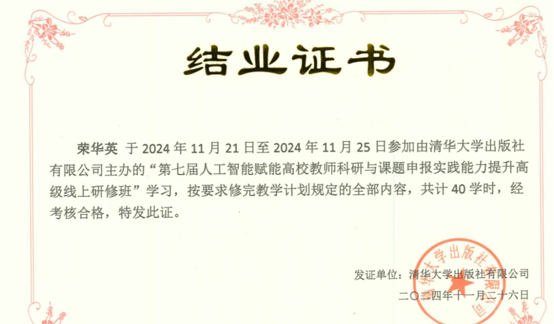 2024年11月21日至25日,由清华大学出版社有限公司主办,广州达智教育管理有限公司及(学术志)北京思高乐教育科技有限公司承办的“人工智能赋能高校教师科研与课题申报实践能力提升高级研修班”第七期成功举办。数字经济产业学院积极支持燕京理工学院国际商学院教师提升科研与课题申报能力,组织荣华英、杨晓青两位教师参加了线上培训。此次培训旨在通过人工智能技术,提高教师的数智化教学科研能力,推进AI技术与教学科研的深度融合。