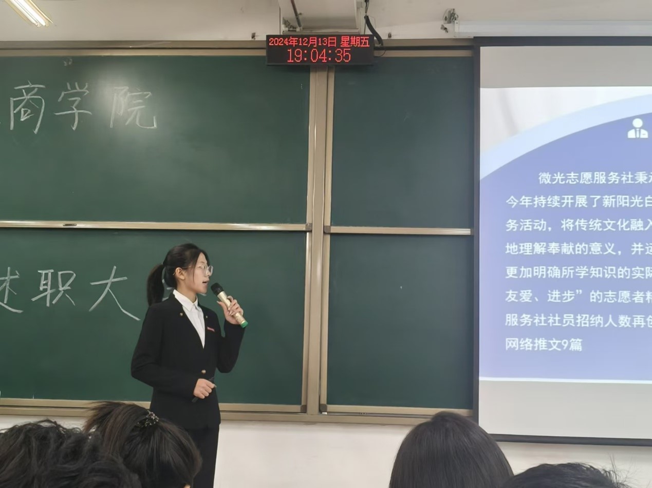 微光志愿服务社负责人详细介绍了本学期社团举办的活动,并提出社团的不足和改进措施。微光志愿服务社在本学期持续开展了新阳光白血病房项目和“寸草心”爱老敬老系列服务项目等志愿服务活动,进入到社区帮助老人下载国家反诈APP并讲解法律知识来提高老人的法律意识。在以后的工作中,微光志愿服务社将开展更多的活动,在帮助他人的同时提高自己的知名度和影响力。