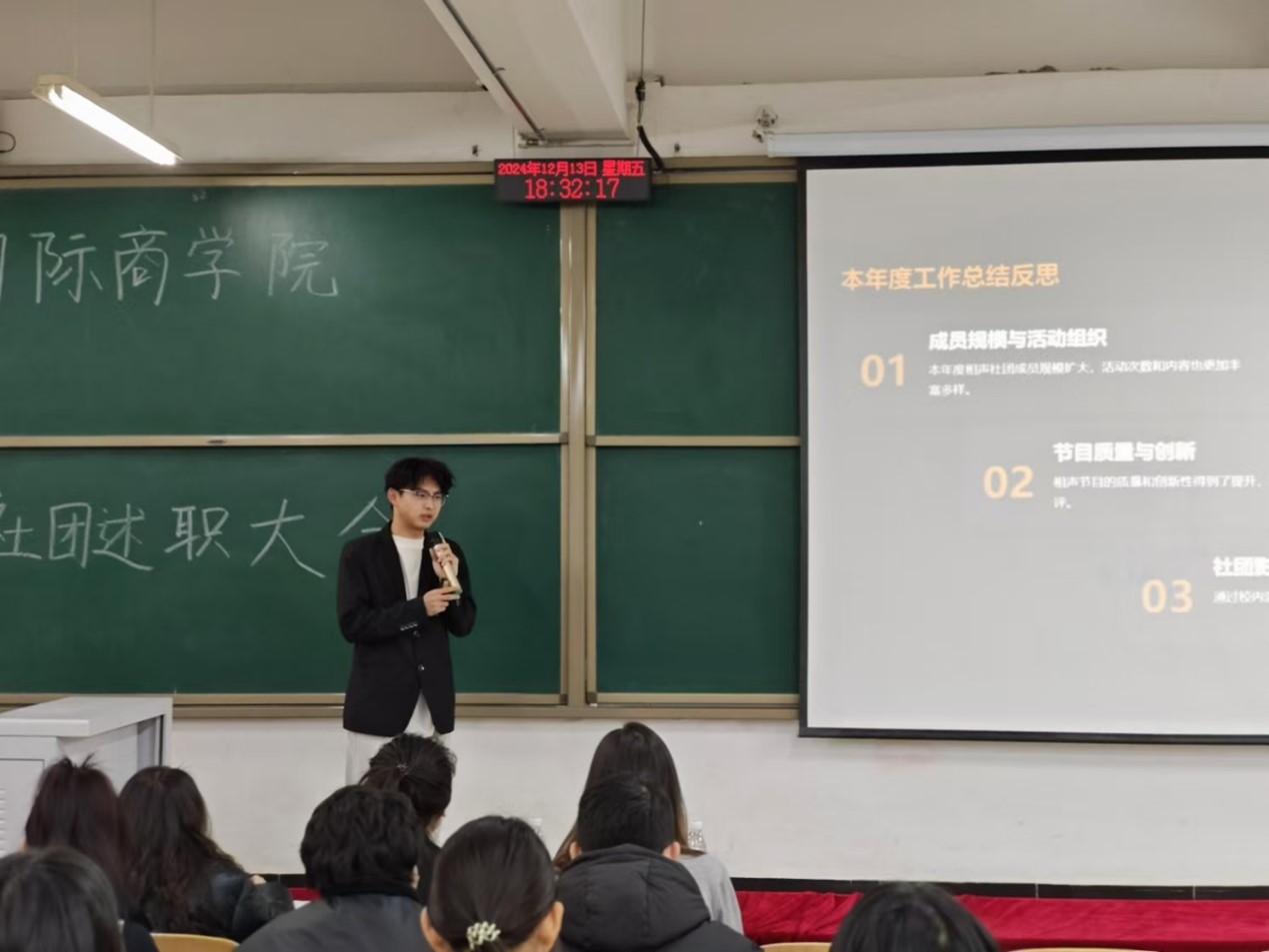 12月13日,团总支社团管理部于综合楼202举办社团工作总结大会,社团管理部指导老师徐霞、团总支学生副书记乔钰轩、团总支学生副书记张媛媛、社团管理部成员及各社团汇报人参与此次大会。