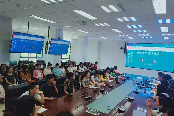 79日上午9:00,国际商学院全体教职工在办公楼328进行了全体大会,院长廉国恩整体回顾了本学期的各项工作,并进行了7-8月暑期的工作的具体安排。张琪副院长针对毕业论文归档、新教师磨课以及暑期4+X活动等进行了具体阐述。贾思博书记针对下学期的学风建设提出了相应的安排。