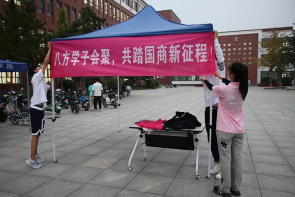 (国际商学院的志愿者们在前一个晚上开始布置迎新现场)