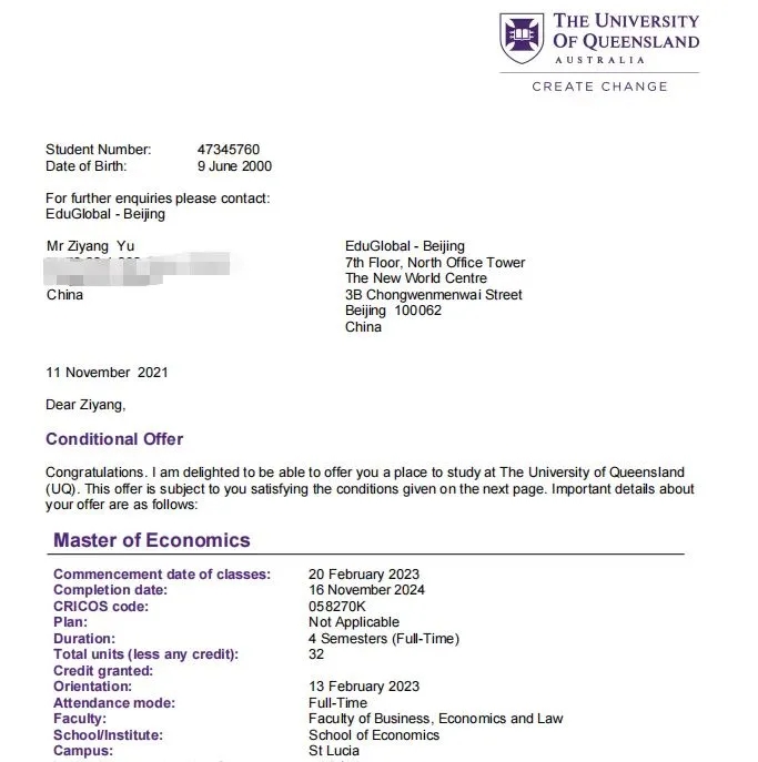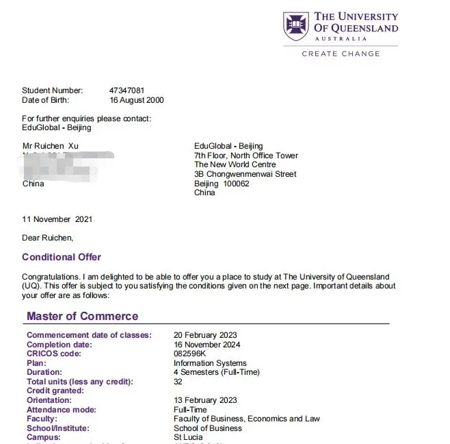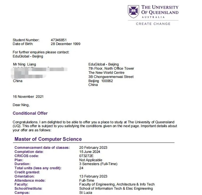 我校信息科学与技术学院徐瑞辰同学和梁宁同学、会计学院于子洋同学和王雪乔同学、传媒学院陈泽龙同学分别获得昆士兰大学(2021QS世界排名第47)商务、信息科学技术、经济学和网络安全专业的Offer。