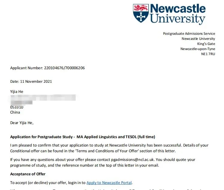 我校文法学院何宜嘉同学获得纽卡斯尔大学(2021QS世界排名第134)应用语言学专业的Offer。