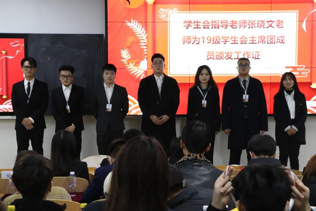 会议在新老学生干部交接仪式中开始。张晓文老师、侯金慧老师、何时雨老师和商月老师为18级主席团成员颁发聘书,为19级主席团成员颁发工作证,19级主席团成员为20级学生会学生干部成员颁发工作证,19级主席团成员为18级主席团成员赠送礼品。