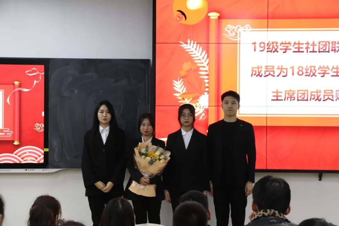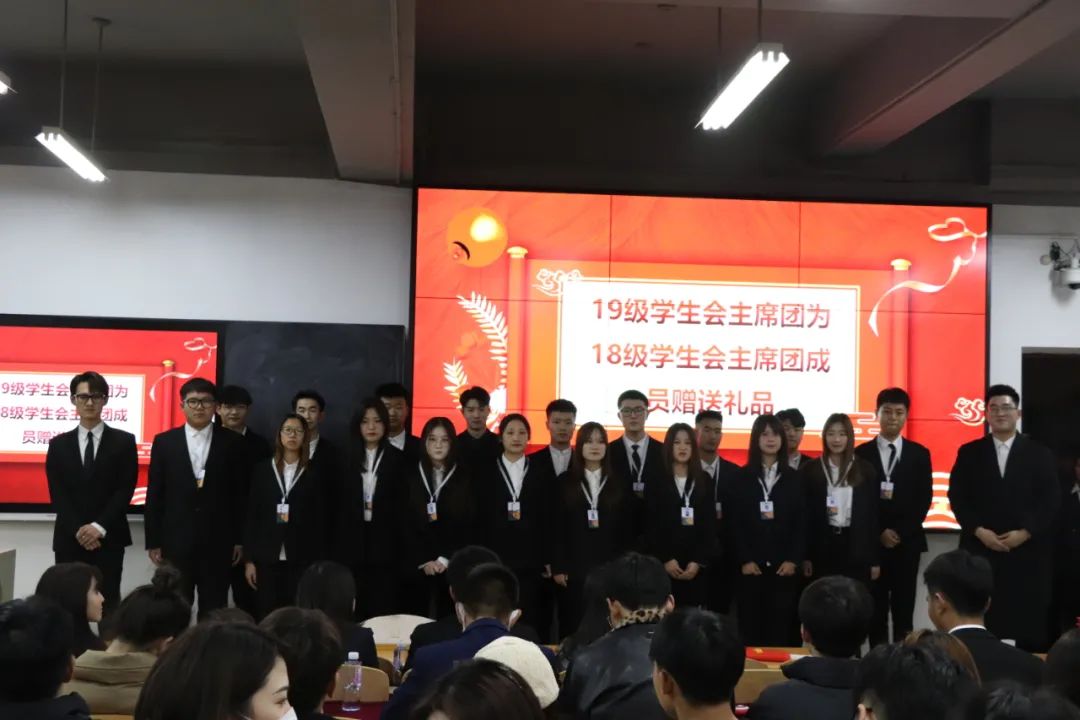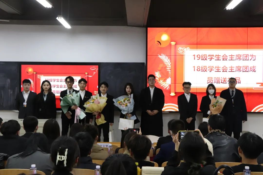 ▲19级学生会主席团成员为18级学生会主席团成员赠送礼物