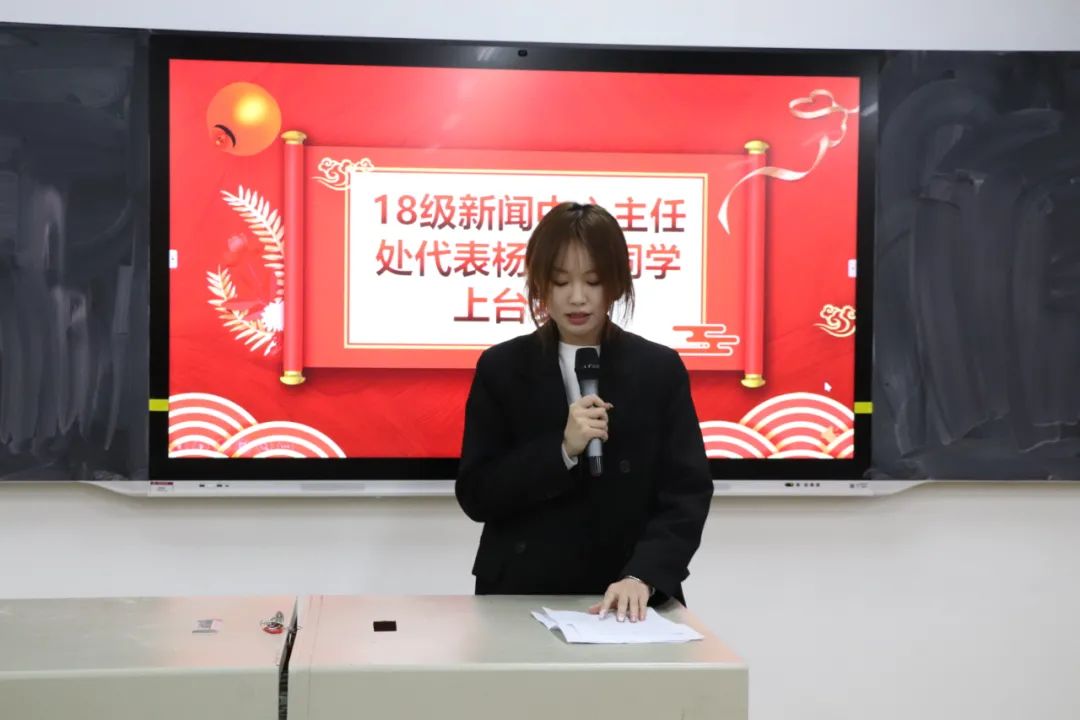 ▲何时雨老师为新闻中心19级主任处成员颁发工作证