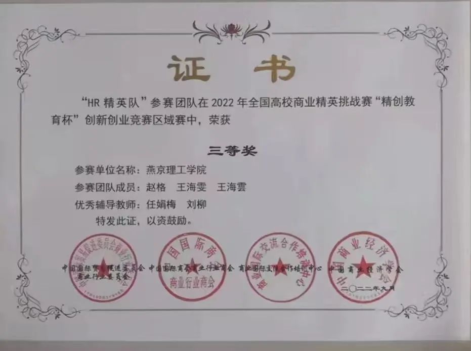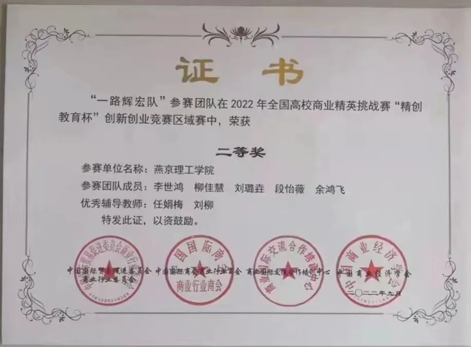 8月27日,2022年全国高校商业精英挑战赛“精创教育杯”创新创业竞赛区预赛通过线上竞赛方式如期举行。在任娟梅老师、刘柳老师的带领下,由国际商学院财管专业2002班李世鸿、柳佳慧、刘璐垚、段怡薇、余鸿飞五名同学组成的“一路辉宏队”喜获区域赛二等奖的好成绩,并获得参与全国总决赛资格。国际商学院人力1902班赵格、王海雲两位同学及会计学院会计学管会1901班王海雯同学组成跨学院参赛队“HR精英队”喜获区域赛三等奖的好成绩。