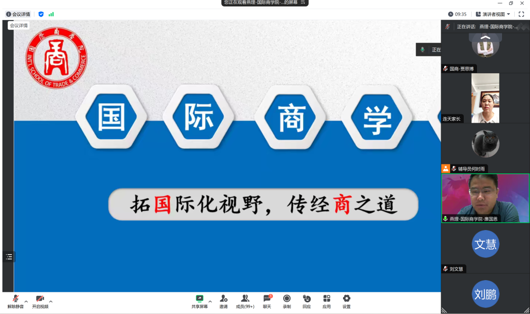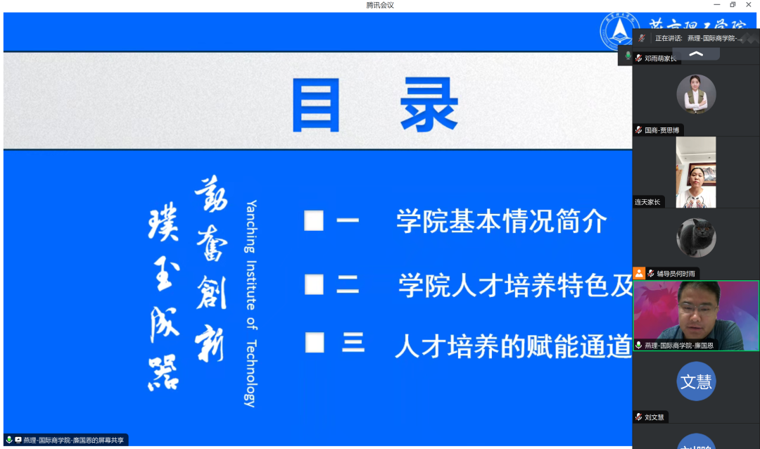 全方位培养优秀人才,加强学校与新生家长沟通交流,发挥家校联动作用,促进家长对学校、学院、专业等全面了解,8月19、20日,国际商学院分四场召开2023级新生线上家长会。参加本次会议的有国际商学院院长廉国恩、党总支书记贾思博、新生辅导员以及全体新生家长。本次家长会由国际商学院党总支书记贾思博主持。