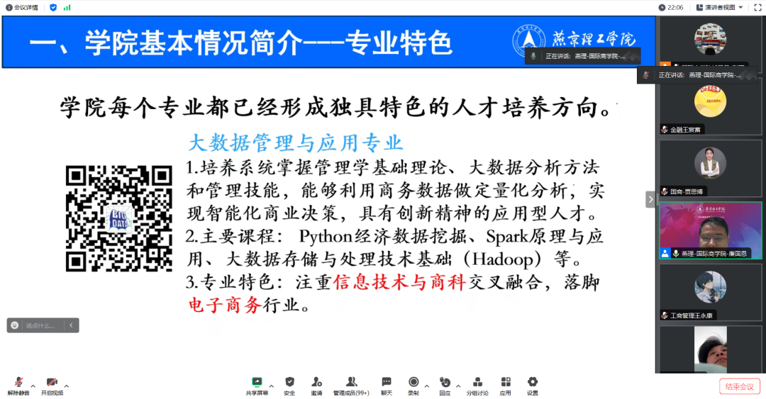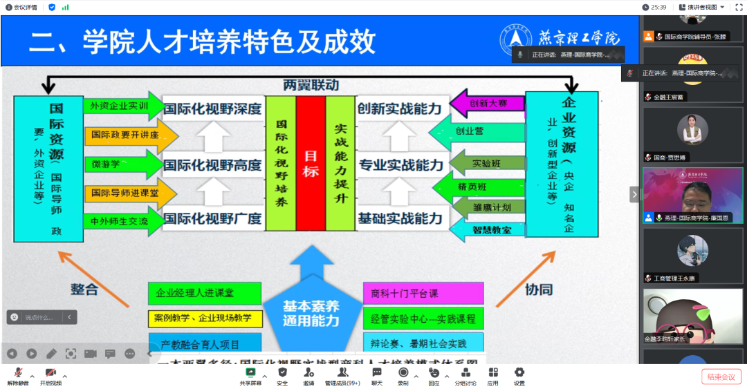 国际商学院院长廉国恩围绕学院基本情况、学院人才培养特色及成效、人才培养的赋能通道三个方面介绍学院概况和人才培养计划。学院以立德树人为根本任务,以培养应用型人才为最终目标,在保证学生学习任务的同时,培养和提升学生的实践能力。最后廉院长着重讲解到人才赋能通道——海外深造和辅修第二专业。在国内考研压力大的背景下,希望家长能了解学校海外深造人才培养计划,早日帮助孩子规划未来,进一步完成学业学历高度上的提升。辅修第二专业是在国家重视培养复合型人才的大背景下,学校成立的特色项目。专业辅修第二专业即能有效满足学生们长远发展、深造与个性化需求,又可以给孩子多一次机会、多一种选择!