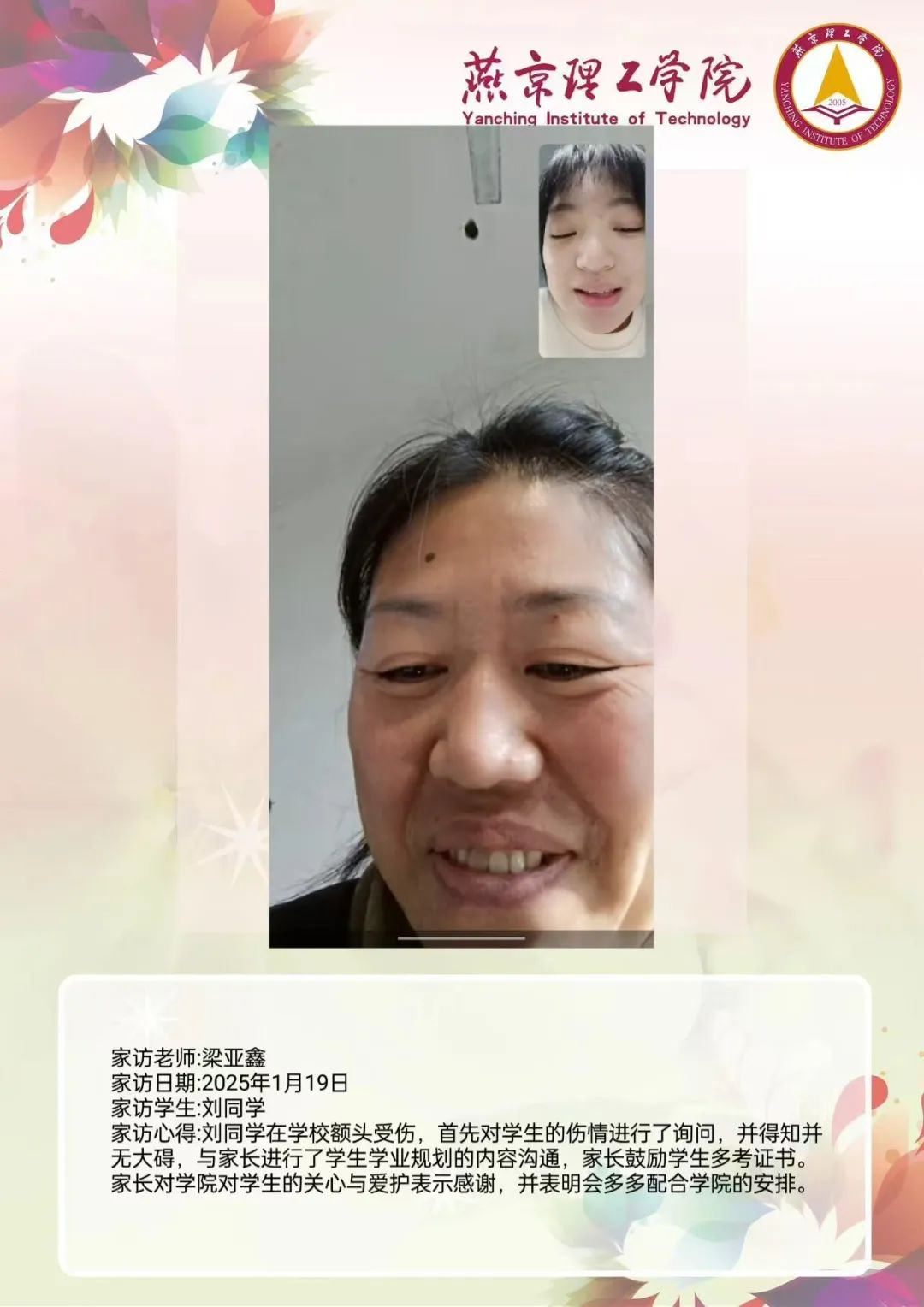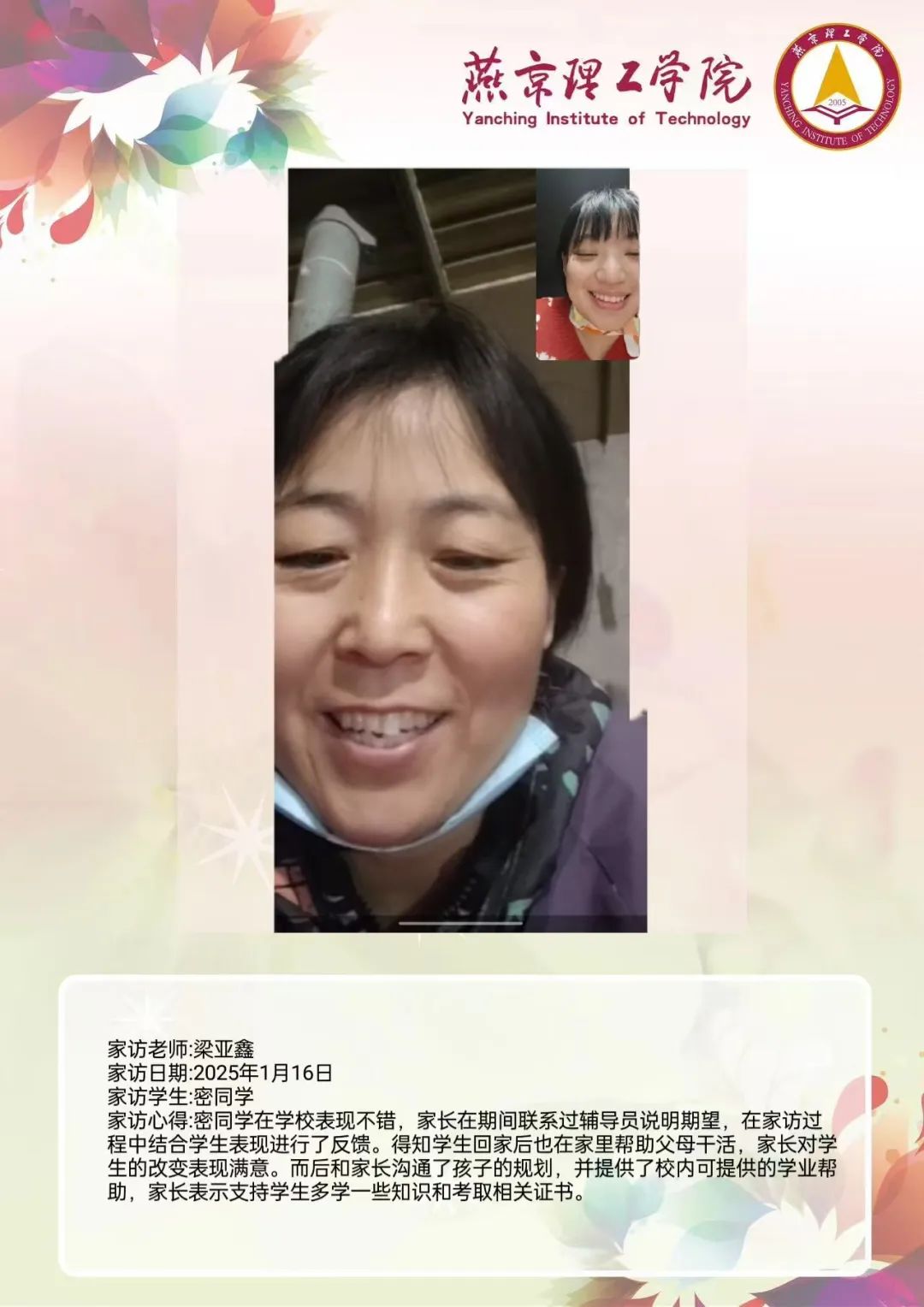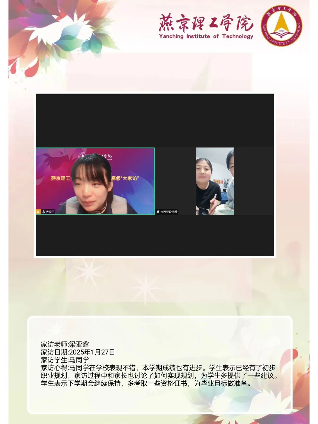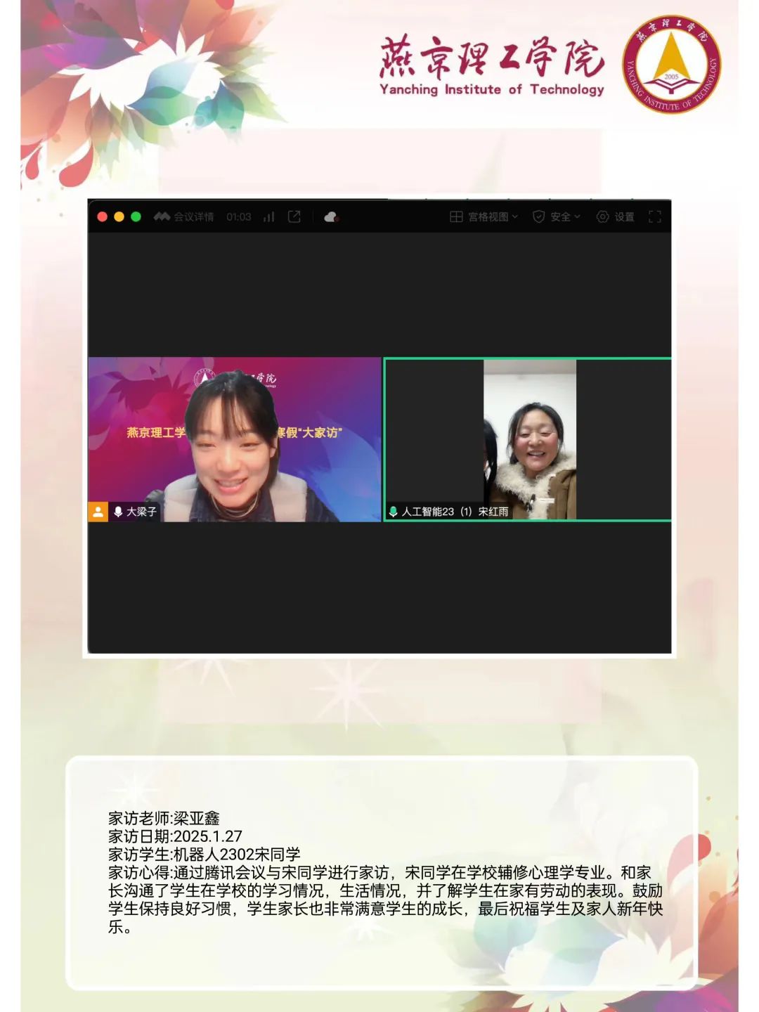 家校携手同心,共筑教育未来。为深入学习贯彻习近平总书记关于教育的重要论述,落实立德树人根本任务,将育人作为出发点和落脚点,深入开展主题教育,加强家校沟通,促进家校共育,智能工程学院认真落实学校关于开展2025年寒假“大家访”活动方案,积极筹备家访工作。辅导员杜啸飞老师通过线上与学生家长进行“云”交流,形成良好的家校联动模式,为学生的成长和发展创造更有利的环境。