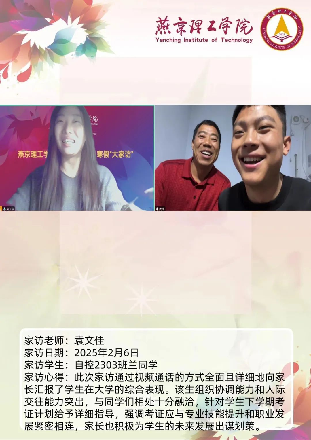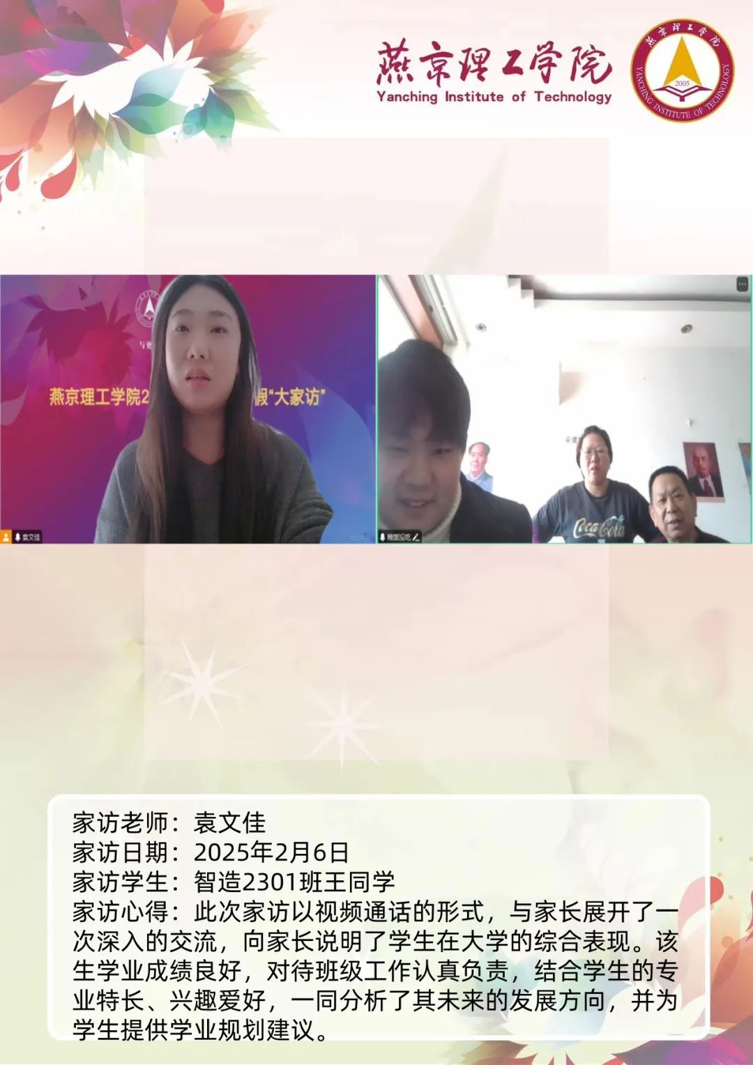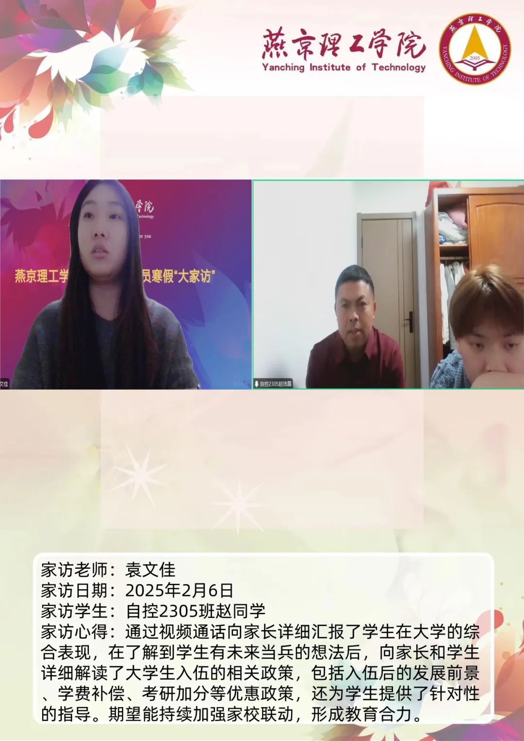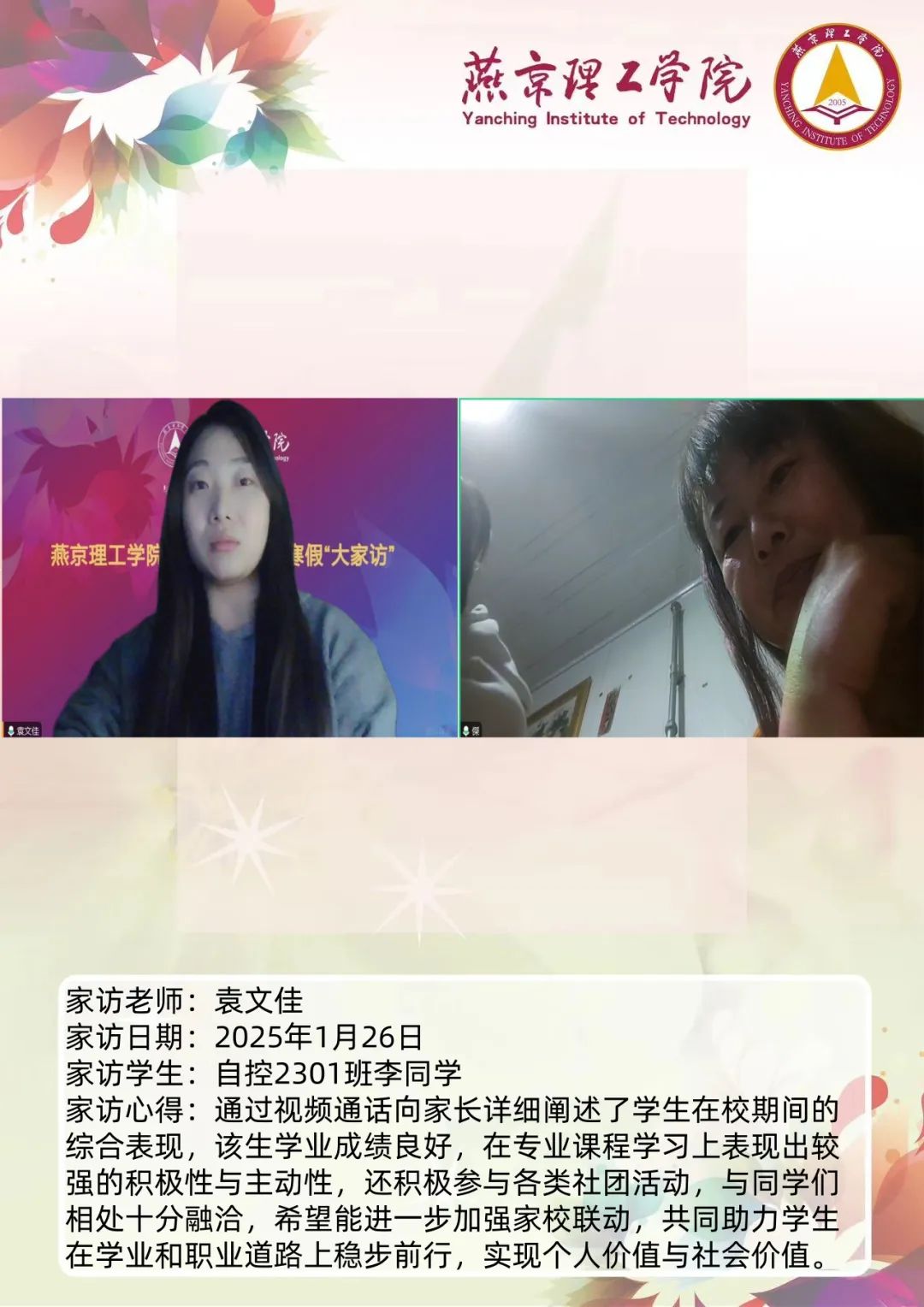 家校携手同心,共筑教育未来。为深入学习贯彻习近平总书记关于教育的重要论述,落实立德树人根本任务,将育人作为出发点和落脚点,深入开展主题教育,加强家校沟通,促进家校共育,智能工程学院认真落实学校关于开展2025年寒假“大家访”活动方案,积极筹备家访工作。辅导员袁文佳老师通过线上与学生家长进行“云”交流,形成良好的家校联动模式,为学生的成长和发展创造更有利的环境。