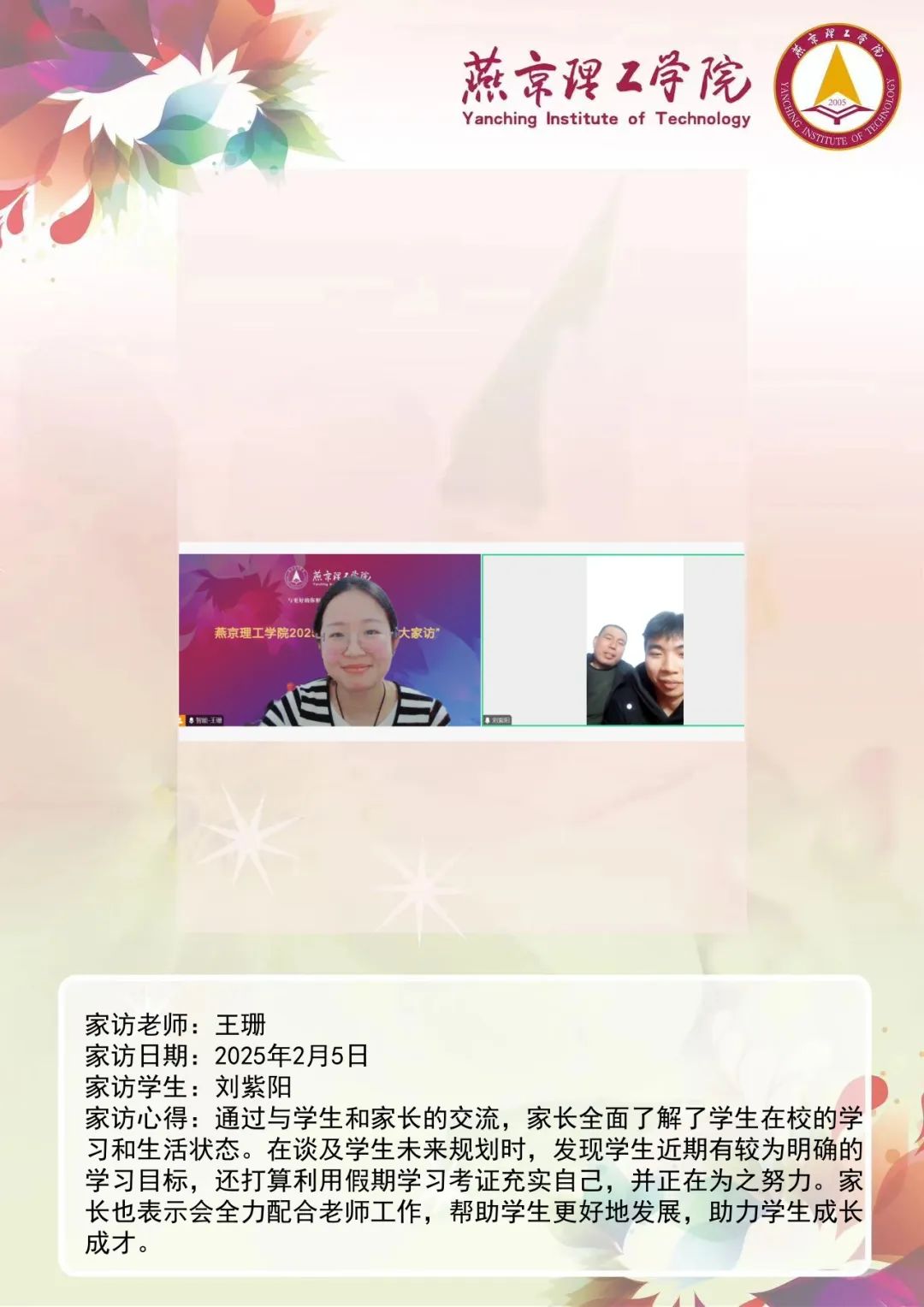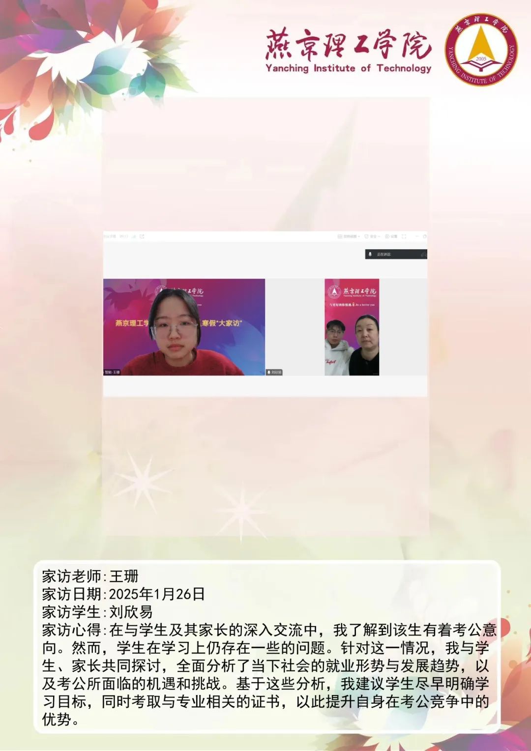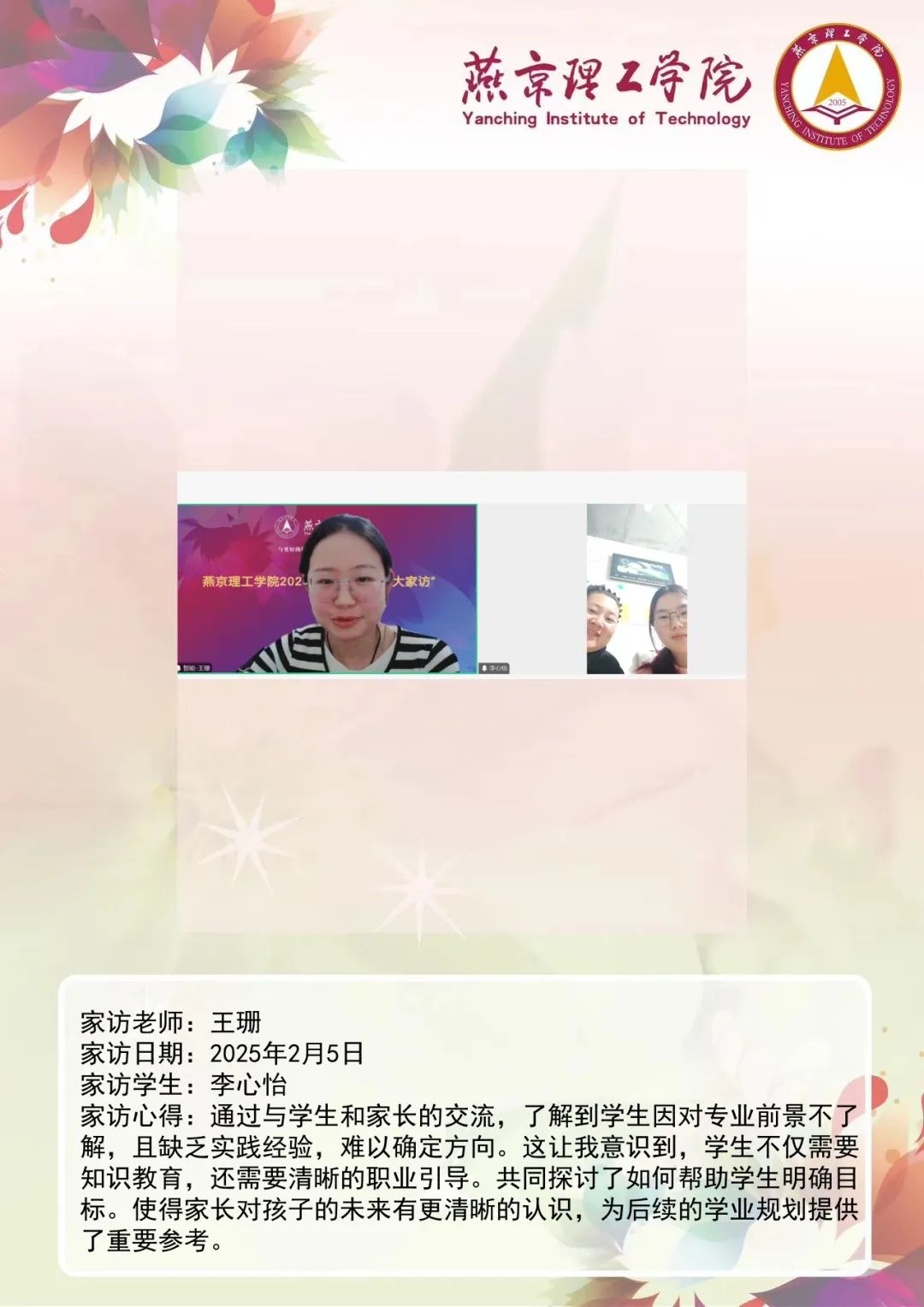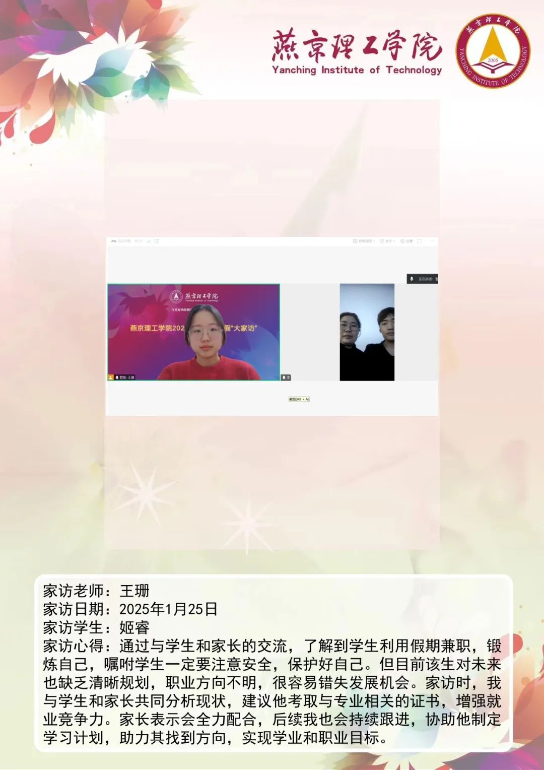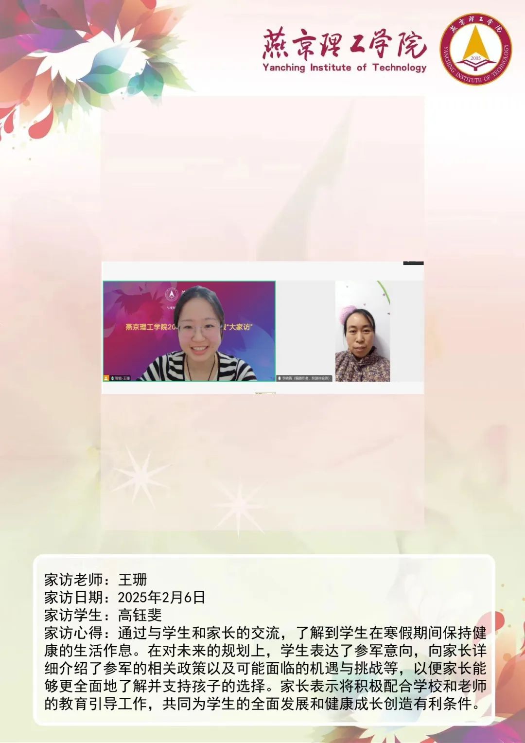 家校携手同心,共筑教育未来。为深入学习贯彻习近平总书记关于教育的重要论述,落实立德树人根本任务,将育人作为出发点和落脚点,深入开展主题教育,加强家校沟通,促进家校共育,智能工程学院认真落实学校关于开展2025年寒假“大家访”活动方案,积极筹备家访工作。辅导员王珊老师通过线上与学生家长进行“云”交流,形成良好的家校联动模式,为学生的成长和发展创造更有利的环境。
