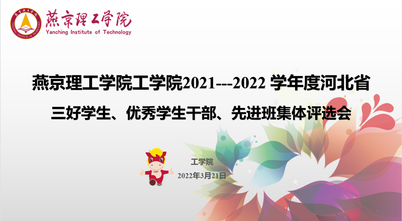 为全面贯彻落实党的教育方针,充分发挥先进典型的示范带动和激励引导作用、进一步展示学校新时代青年学生奋发向上的精神面貌,根据河北省教育厅《河北省教育厅关于评选 2021—2022 学年省级三好学生、优秀学生干部和先进班集体的通知》(冀教德育〔2022〕5 号)精神,工学院于3月21日下午举行河北省三好学生、优秀学生干部和先进班集体线上评选会。