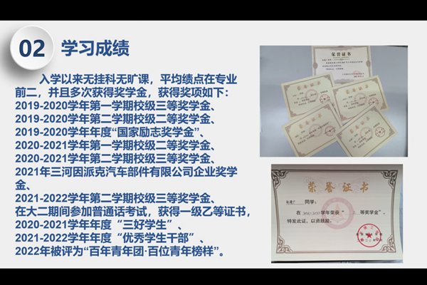 张海霞老师宣读评选要求,参评学生按照顺序依次展示四年来在思想、学习、工作等方面取得的成绩,评委对学生提交的参评材料以及现场表现进行综合打分。
