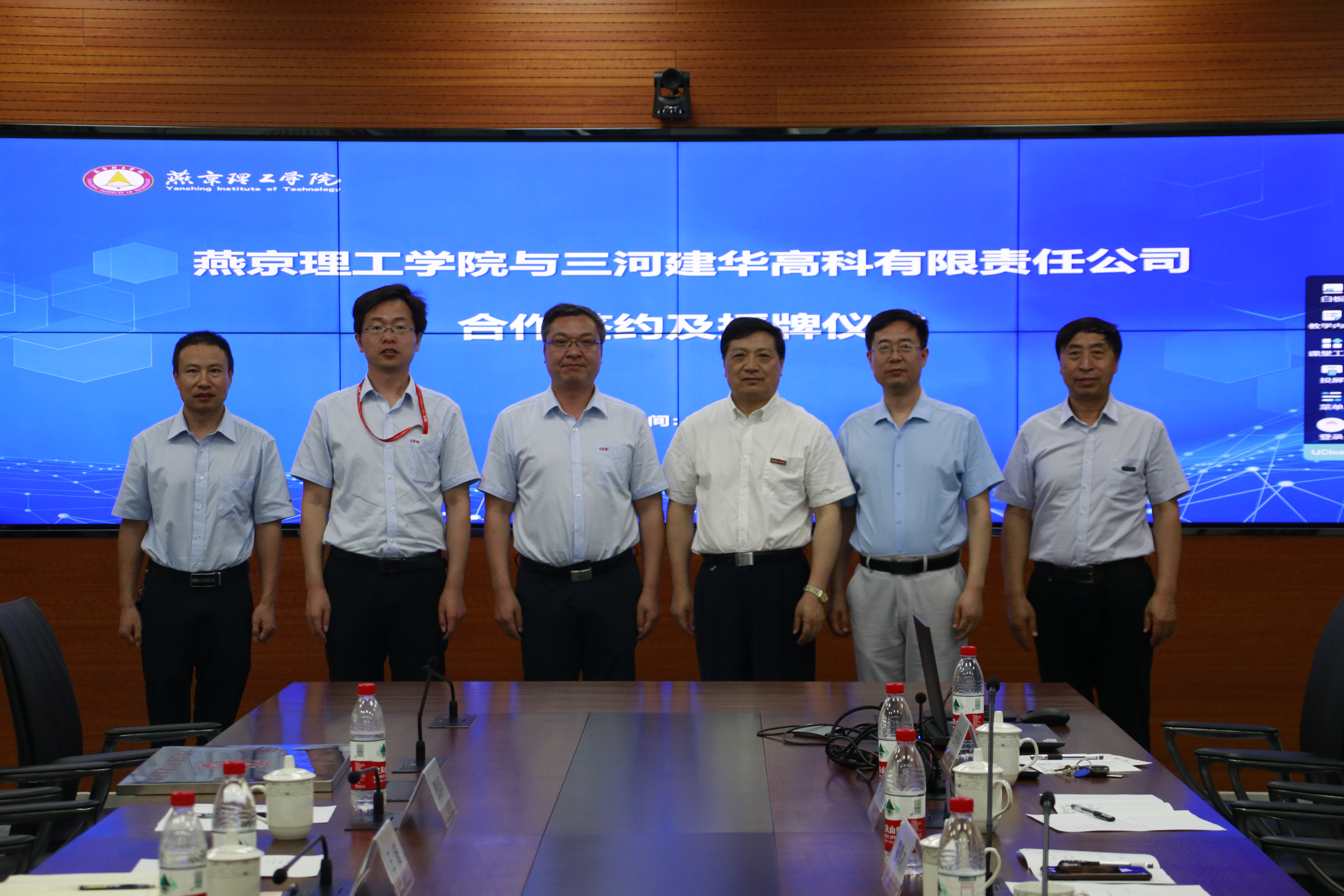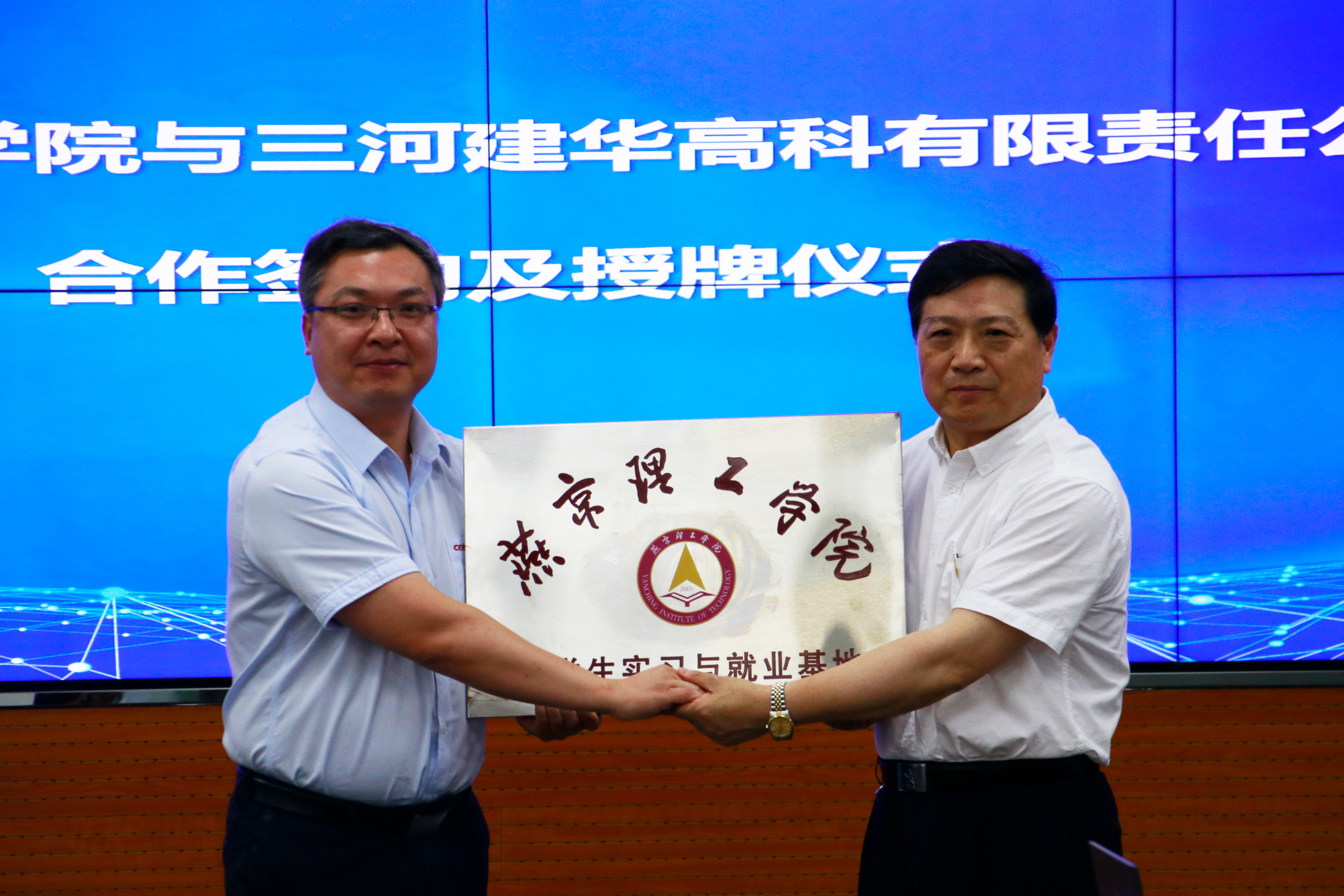 智能工程学院院长李秋生和建华高科有限责任公司总经理段成龙代表校企双方签订校企合作协议,杨庚宇校长为三河建华高科有限责任公司授予燕京理工学院大学生实习就业基地牌匾。