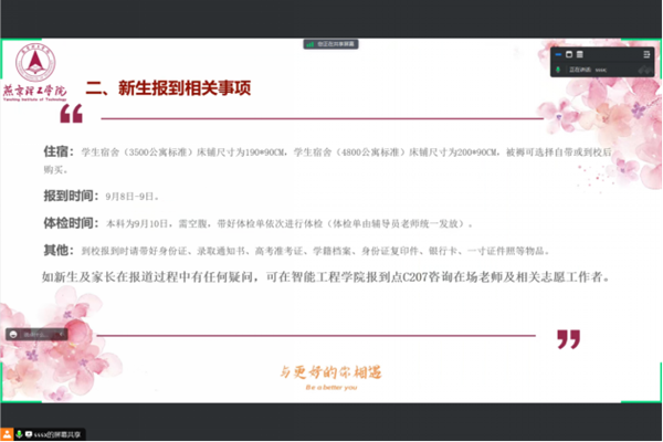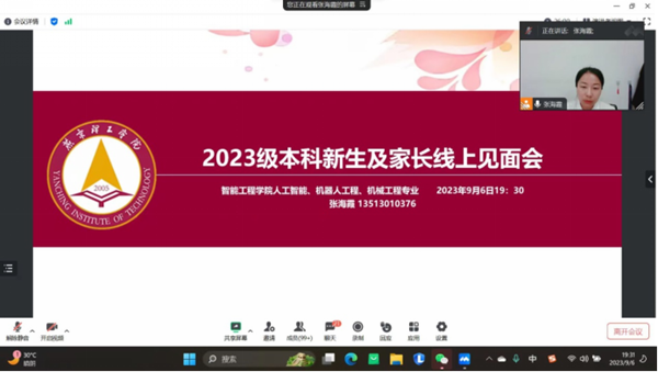 2023年9月6日晚七点,为了帮助新生更好地适应大学生活,搭建互相了解、熟悉彼此的平台,智能工程学院特别安排了一场辅导员与新生线上见面会。智能工程学院新生辅导员老师参加了此次会议,为新生们解答疑惑,提供指导。