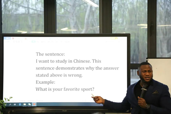 接着,Lloyd以“I am busy ___ work”为例,引出本周英语角的主题:雅思口语考试中常见的语法错误。他让同学们填写空格中的介词,同学们一共给出了4个答案,分别是with, on, in和at,其中只有with和at是正确的,说明有些同学对介词的掌握并不熟练。Lloyd针对这个句子为学生们详细地讲述了中国学生在介词使用中容易出现的语法问题。