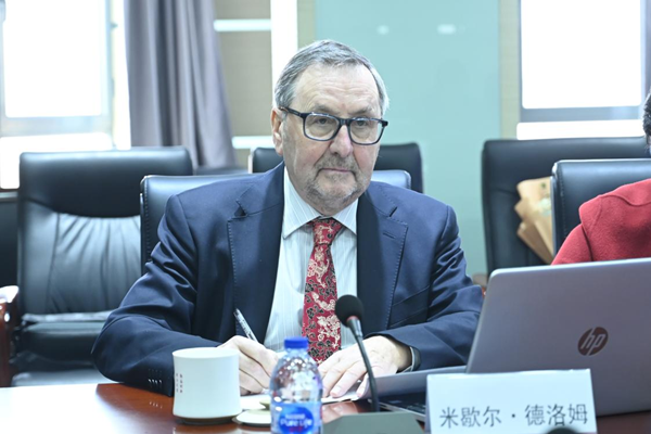米歇尔·德洛姆博士一行,学校校长杨庚宇,党委副书记、副校长王传超,副校长吴汶燕及相关二级学院院长在528会议室举行座谈会。