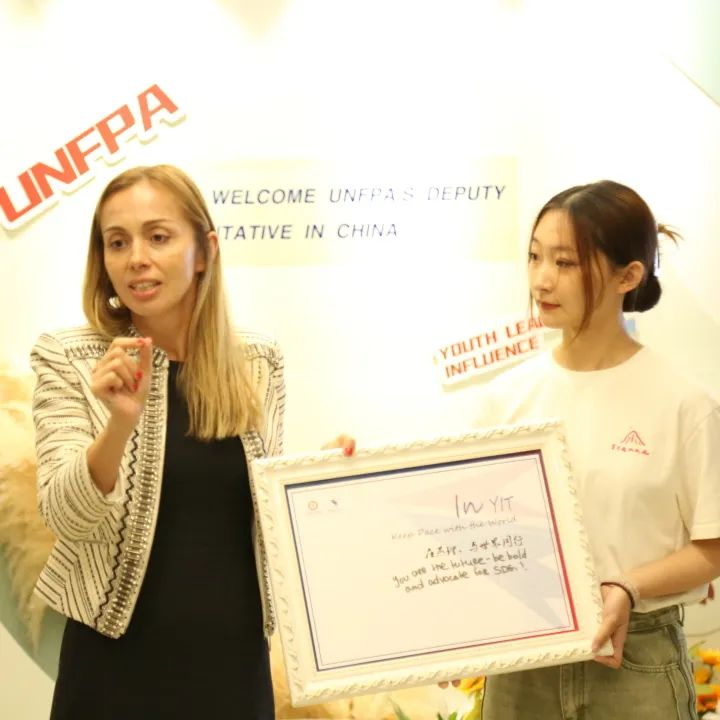 在国际学苑一层大厅,欧雯珊女士与我校学生代表共同参与“时代青年 共话未来”主题活动,畅谈青年领导力与社会责任。“联合国人口基金UPower计划:青年榜样影响力培训”校园大使代表任泓铮、尚明硕、吴晓闪、杨思佳、王天祎等同学与欧雯珊女士就参加校园大使培训期间的课题进行了汇报。