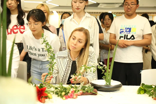 交流活动结束后,活动主持人又邀请欧雯珊女士与现场的同学们一起体验中式插花。中式插花是心灵和自然的结合,借花传情,以花赠友。活动特邀国家高级花艺师朱明辉为欧雯珊女士详解花艺知识及插花技艺。客从远方来,多以茶相待。戏剧影视导演专业任艺青同学是国家中级茶艺师,她以茶会友,现场进行了茶艺表演,邀请欧雯珊女士和在场同学们一起品茗。最后,第八届校园大使曾祥军同学演唱了英文版《水调歌头》,让欧雯珊女士和现场同学感受了中华诗词之美。