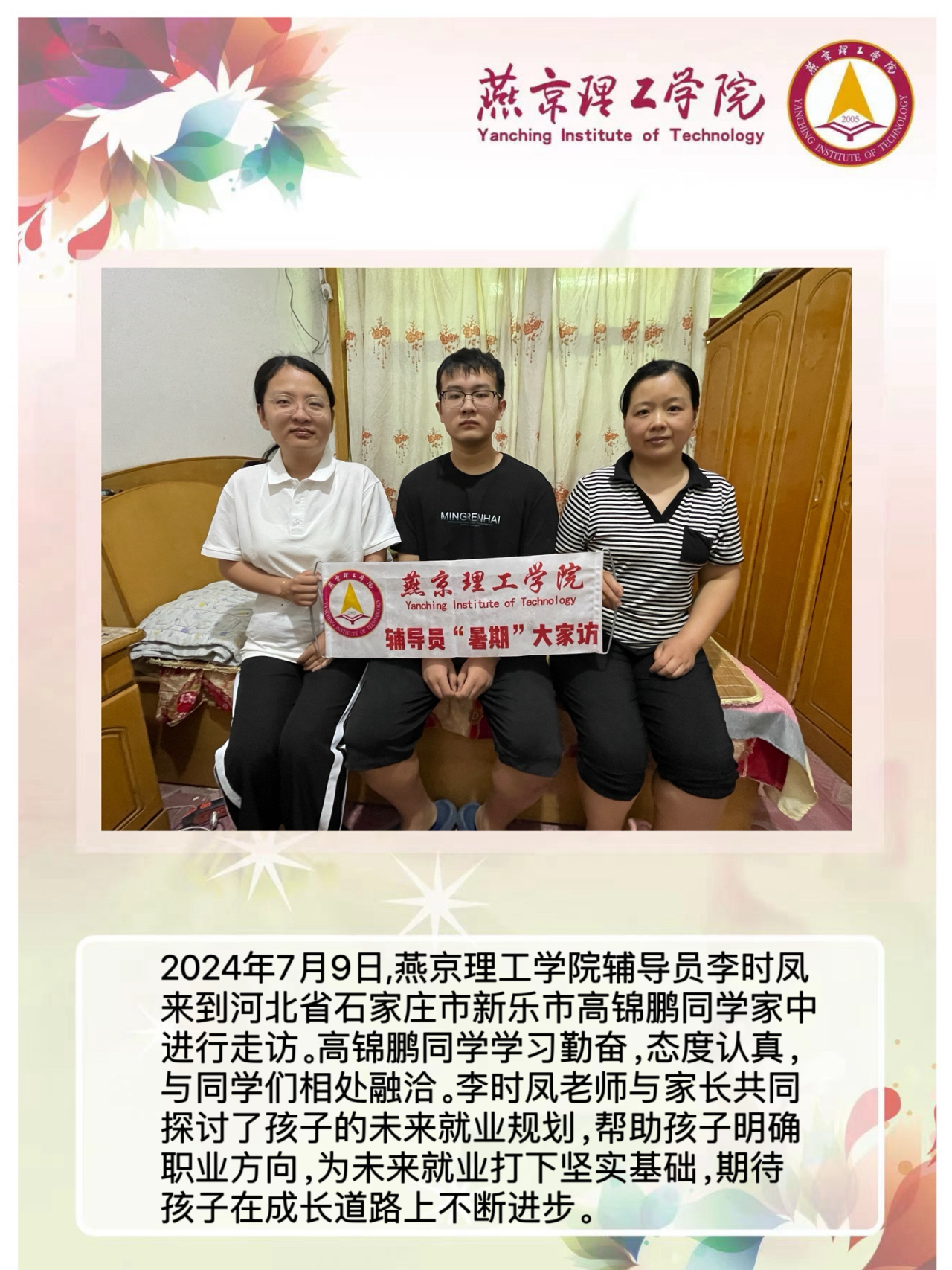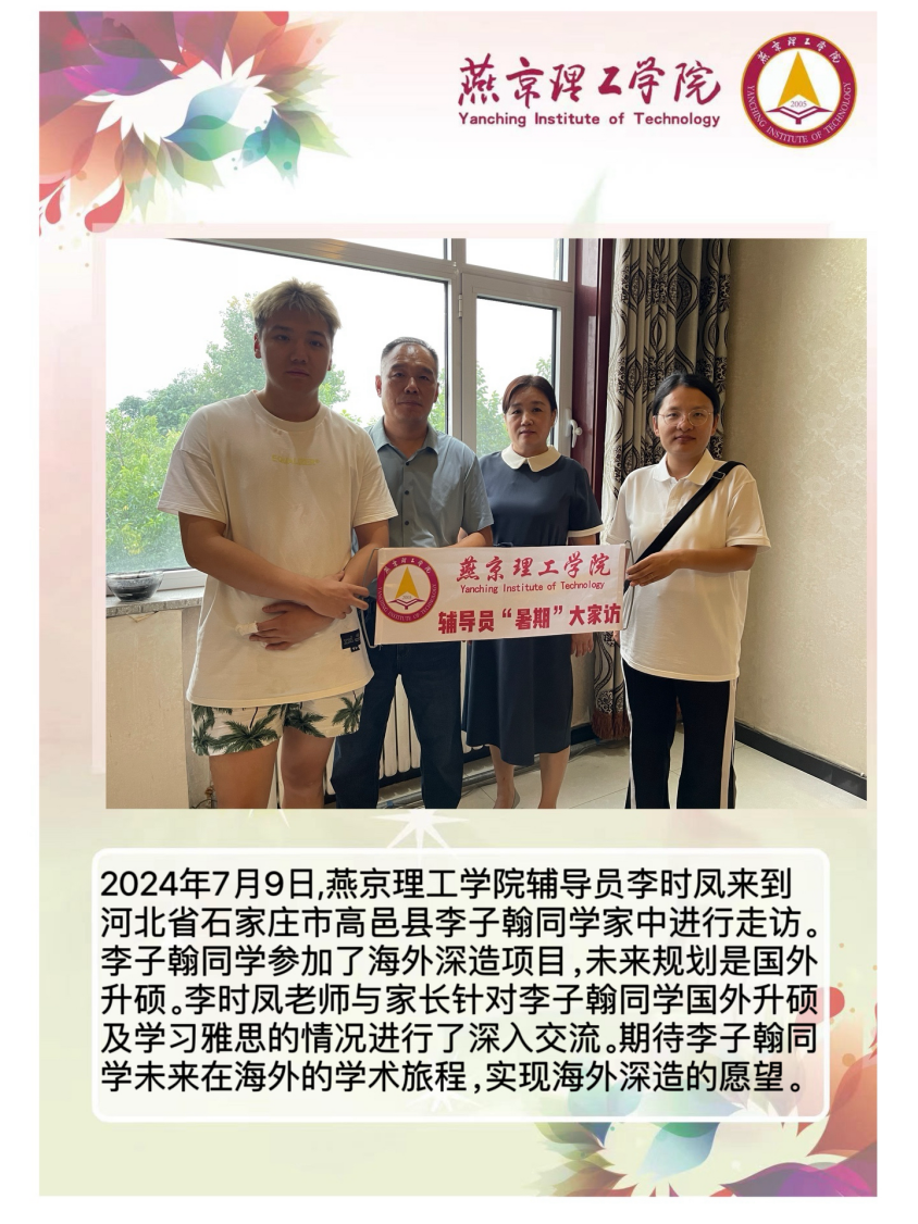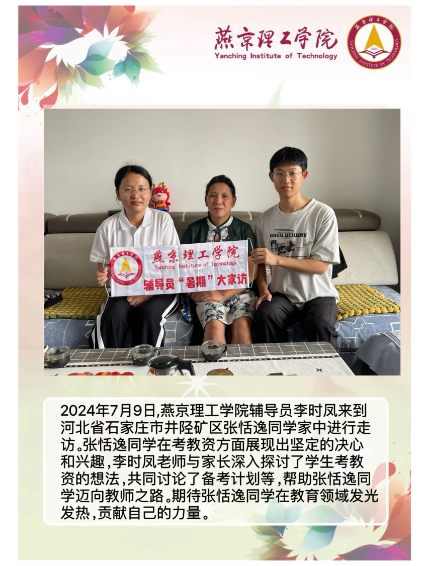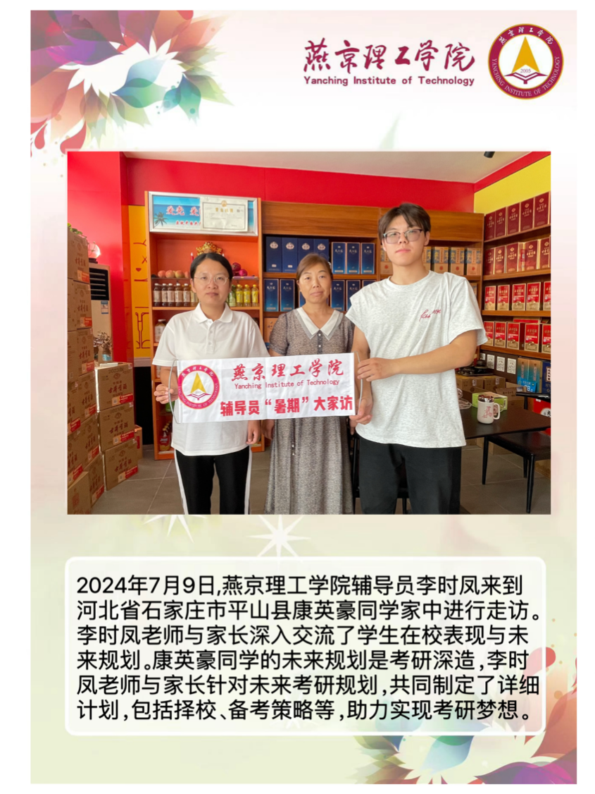 家校携手同心,共筑教育未来。为深入学习贯彻习近平总书记关于教育的重要论述,落实立德树人根本任务,将育人作为出发点和落脚点,深入开展主题教育,加强家校沟通,促进家校共育,智能工程学院积极响应河北省教育厅《关于开展全省高校辅导员2024年暑期“大家访”活动的通知》要求,认真落实学校关于开展2024年暑期“大家访”方案,积极筹备家访工作。辅导员李时凤老师深入学生家庭,通过实地考察,以“面对面”的方式对学生进行了解和教育,形成良好的家校联动模式,为新时代大学生的成长成才之路提供了更强有力的保障。智能工程学院辅导员暑期大家访持续进行中。