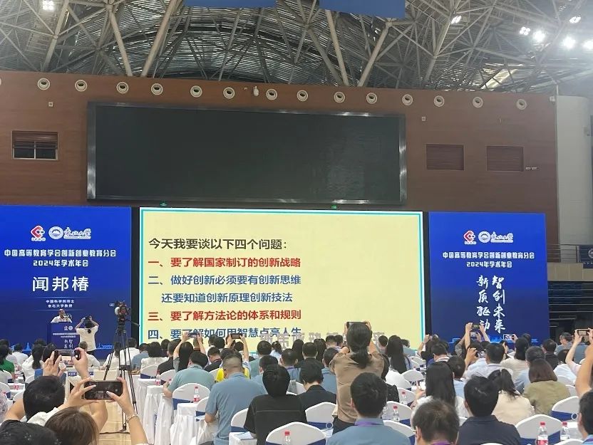 本次年会共分为三部分举行。首先举行了中国高等教学学会创新创业教育分会全体会员大会,徐飞教授做了工作报告,审议了分会2024年新增会员单位、理事单位、常务理事单位名单。接下来中国科学院院士闻邦椿教授做了主题为“创新改变世界,智慧点亮人生”的报告,张兆国教授做了主题为“校区与创新园区相结合,培养新质创新创业人才”的报告,魏江教授做了主题为“数字创业:模型构建与逻辑意义”的报告,几场主旨报告涉及内容丰富,启发异常深远,对我院未来的创新创业教育将会起到飞船积极的引导作用。
