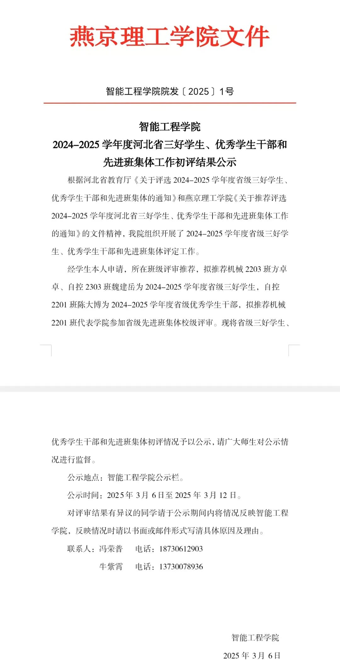 为深入贯彻落实河北省教育厅关于评选省级三好学生、优秀学生干部的相关要求,充分发挥优秀学生的榜样引领作用,激励广大学生积极进取、全面发展,智能工程学院于202535日在办公楼525会议室成功举行省级三好学生、省级优秀学生干部和先进班集体评审会。智能工程学院院长李秋生、副院长刘继超、党总支书记冯荣普、专业任课教师代表和全体辅导员老师担任评委,学生候选人及候选班集体参与此次会议。