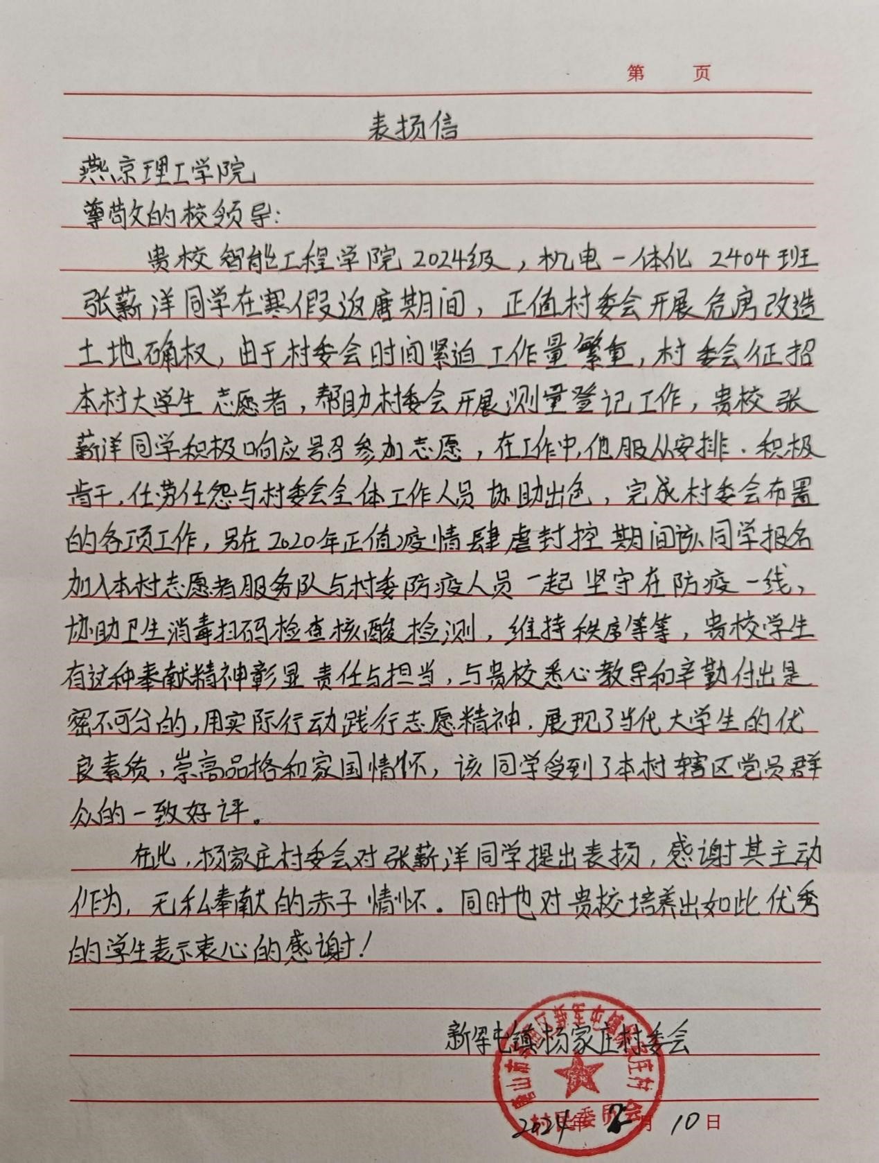 春风化雨润无声,萤虫流光暖寒窗。 近日,我校收到一封特殊的信件—新军屯镇杨家庄村委会发来的表扬信,主角是智能工程学院2024级机电一体化2404班的张薪洋同学。他用行动诠释了当代大学生的责任与担当,下面让我们一同走进他的志愿故事。