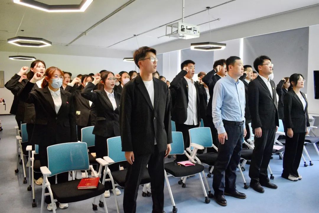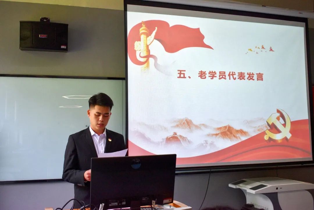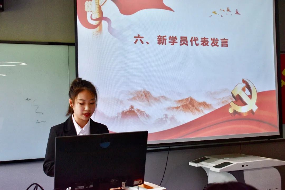 优秀学生党员代表才霞、上学期优秀学员代表汪金龙和本学期学员代表李静怡分别发言。在李静怡同学的带领下,全体新学员进行宣誓,立志成为有理想、有本领、有担当的新时代青年,争做骄傲的燕理人,争当新时代的创造者,将加入中国共产党作为一生崇高追求。