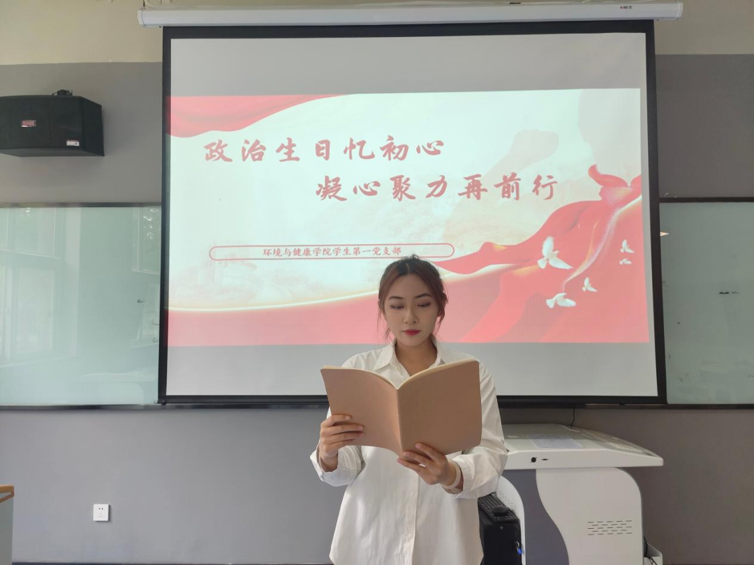 会议伊始,环境与健康学院学生第一党支部学生副书记才霞同志带领全体党员同志重温入党誓词,全体党员同志紧握右拳,面对党旗,庄严宣誓,回忆入党宣誓时的郑重承诺,眼神坚定,庄重严肃。通过重温入党誓词,汲取奋进力量,激励各位党员在新征程上永葆初心、勇担使命、终身践行入党誓词,立足岗位、履职尽责、践行使命,努力做新时代合格的“答卷人”。