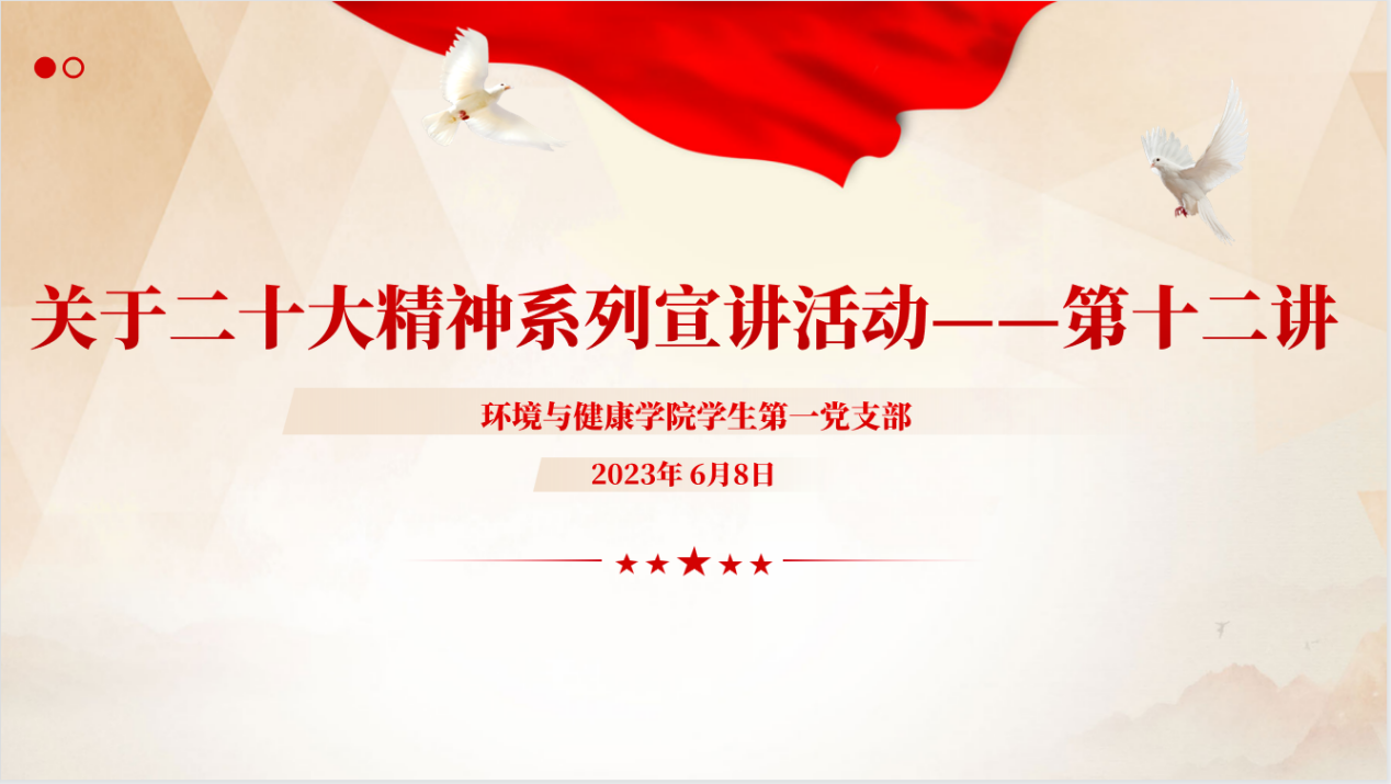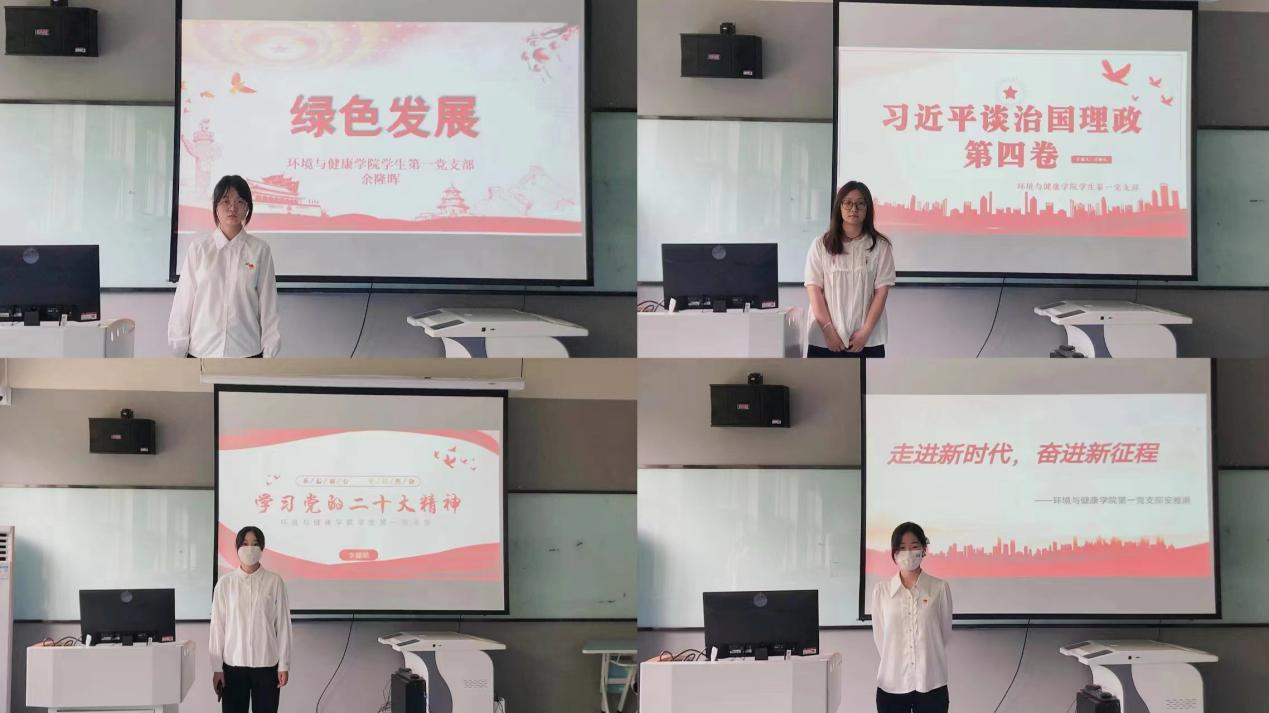 为进一步深入学习贯彻习近平新时代中国特色社会主义思想,认真贯彻落实习近平总书记关于教育的重要论述,持续巩固深化拓展党史学习教育成果,激励广大青年党员牢记初心使命,坚定理想信念。特此,环境与健康学院学生第一党支部全体党员于2023年6月8日在居107开展《二十大宣讲》PPT展示活动。以实际行动持续深入学习党的二十大的精神,从而进一步提高党员的思想认识。本次活动由环境与健康学院学生第一党支部学生副书记才霞和组织委员刘博奥主持。