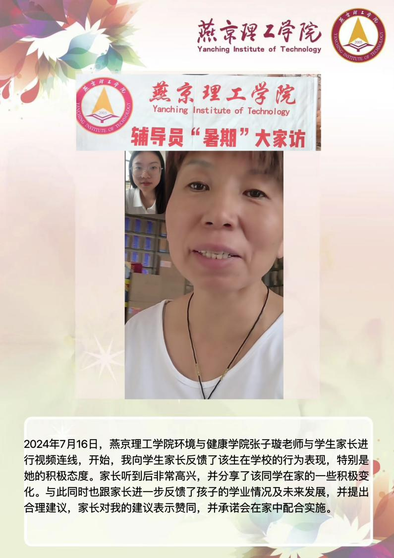 2024年7月16日,燕京理工学院环境与健康学院张子璇老师与学生家长进行视频连线,向学生家长反馈了该生在学校的行为表现,特别是学生的积极态度。家长听到后非常高兴,并分享了该同学在家的一些积极变化。与此同时也跟家长进一步反馈了孩子的学业情况及未来发展,并提出合理建议,家长对所提出的建议表示赞同,并承诺会在家中配合实施。