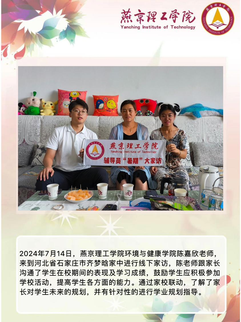 2024年7月14日,燕京理工学院环境与健康学院陈嘉欣老师,来到河北省石家庄市齐梦晗家中进行线下家访,陈老师跟家长沟通了学生在校期间的表现及学习成绩,鼓励学生应积极参加学校活动,提高学生各方面的能力。通过家校联动,了解了家长对学生未来的规划,并有针对性的进行学业规划指导。