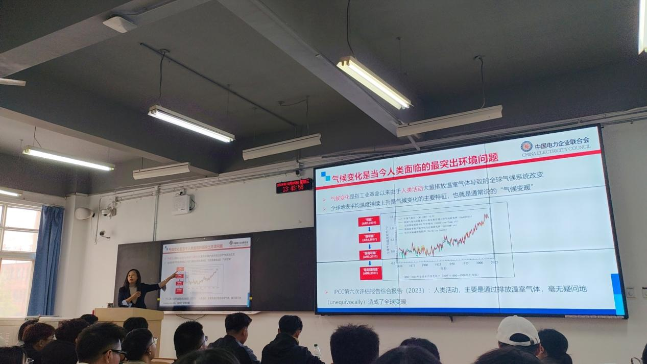 讲座伊始石处长以《双碳目标下中国电力行业发展成就》为主题,剖析“双碳”背景下国内外背景,随着全球气候变化问题日益严重,减少温室气体排放成为全球共识,电力行业在实现“双碳”目标进程中扮演中至关重要的角色,给同学们带来了一场深刻而前沿的学术盛宴。