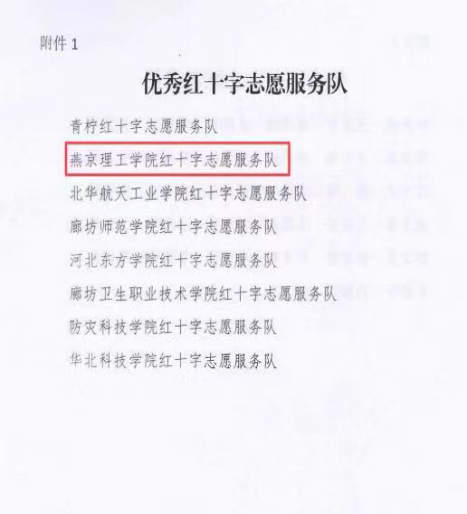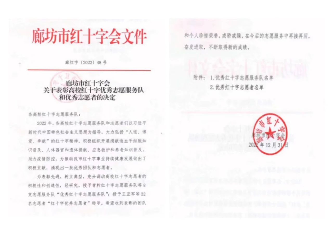 2022年12月,廊坊市红十字协会授予燕京理工学院红十字志愿服务队“优秀组织”称号,志愿队中8名志愿者获评“优秀志愿者”称号。
