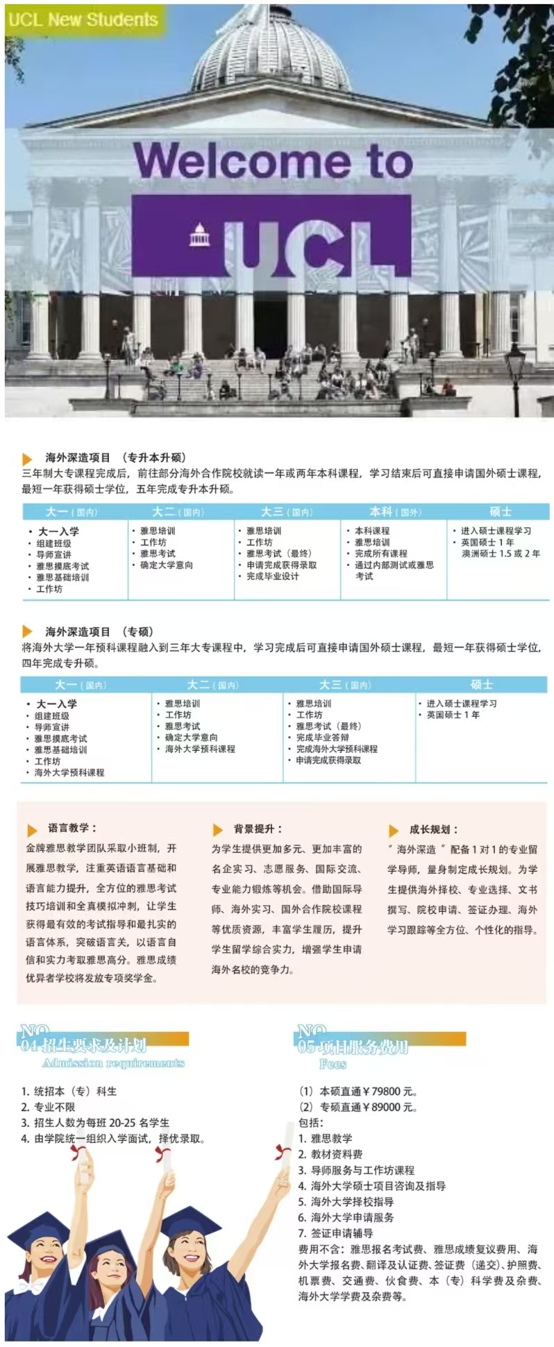 统招录取的学生通过海外深造专硕直通“专升硕”培养模式,完成国内高校专科学业后,衔接海外大学3个月至1年的硕士预科课程,随后可申请升读海外大学硕士课程,满足学位授予条件者可获得海外大学硕士学位。