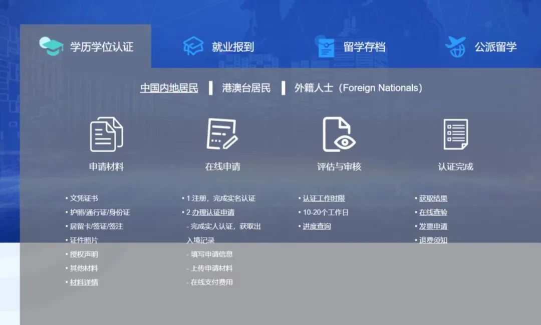 在国外学习的申请人:应提供在外学习期间使用的护照。需扫描上传的内容包括:首页(个人信息页)、学习期间签证页(电子签或居留卡也需提供)。如所认证的文凭证书早于10年前颁发,申请人还需提供学习期间使用的护照上所有的出入境章。