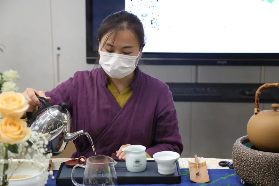 讲解结束后,在呦呦琴音中,助理茶艺师赵春英为大家表演了沏茶的方式。从最开始的洗茶具给茶杯进行清活和提湿,再进行剪茶叶、摇香、温杯、洗茶、分茶汤,到最后品茶时,也是要先闻再后三品,方能体味出茶的清香甘甜。茶能静心,水能清尘,在琴韵茶烟中,同学们了解了茶艺,将身心沉静下来,接受茶文化的熏陶。