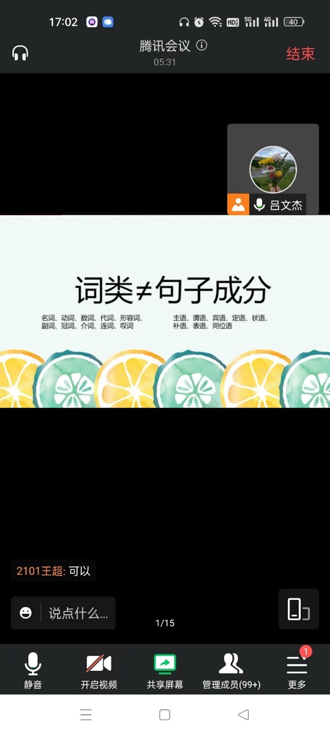 吕文杰老师以长句“A beautiful teacher called Lily is teaching you difficult language, English, and how you can solve various gammar problems.”为例引出句法和词法的区别,讲解词类不等于句子成分,并对句子成分加以分析,为学生们的语法学习奠定了基础。