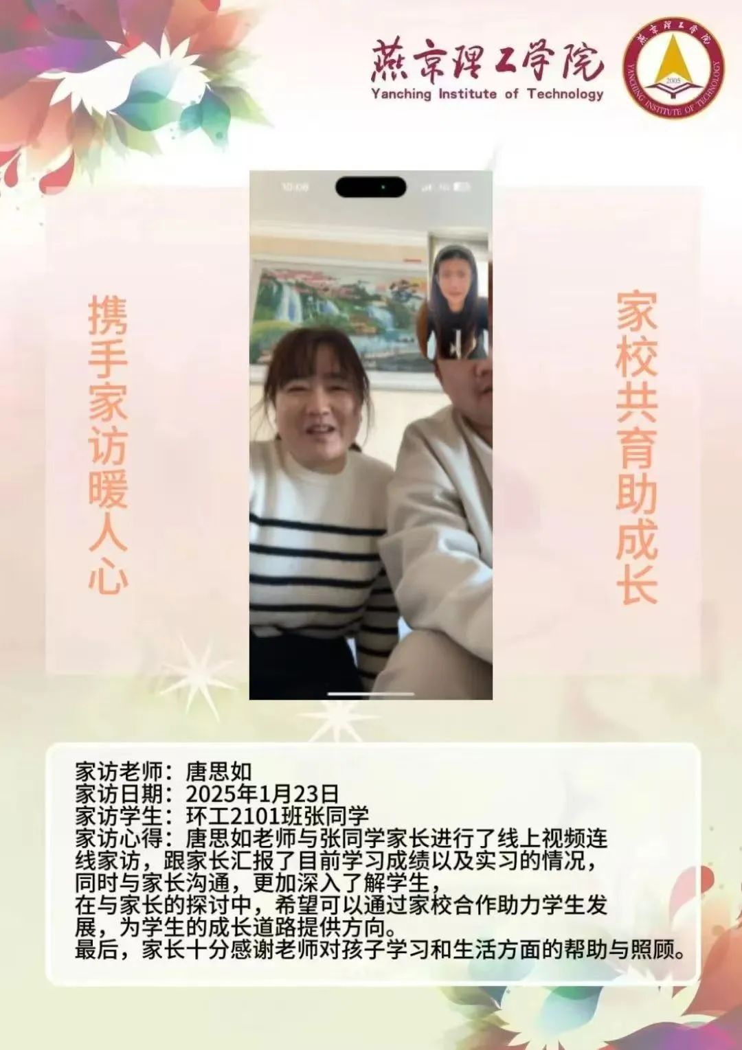 为深入贯彻全员育人、全过程育人、全方位育人的方针,切实提升人才培养质量,搭建学校与家庭之间稳固的沟通桥梁,整合校内外教育资源,形成紧密联动的育人格局,契合教育发展新形势与学校人才培育实际需求,环境与健康学院开展2025年寒假“携手家访暖人心 家校共育助成长”主题活动。