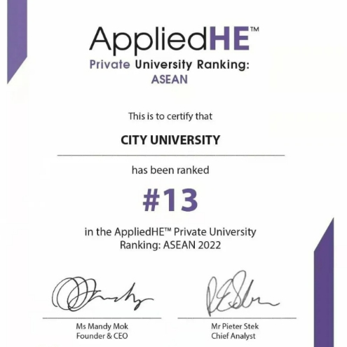 马来西亚城市大学在2022年AppliedHE东盟私立大学排名中获得几项优越的排名: