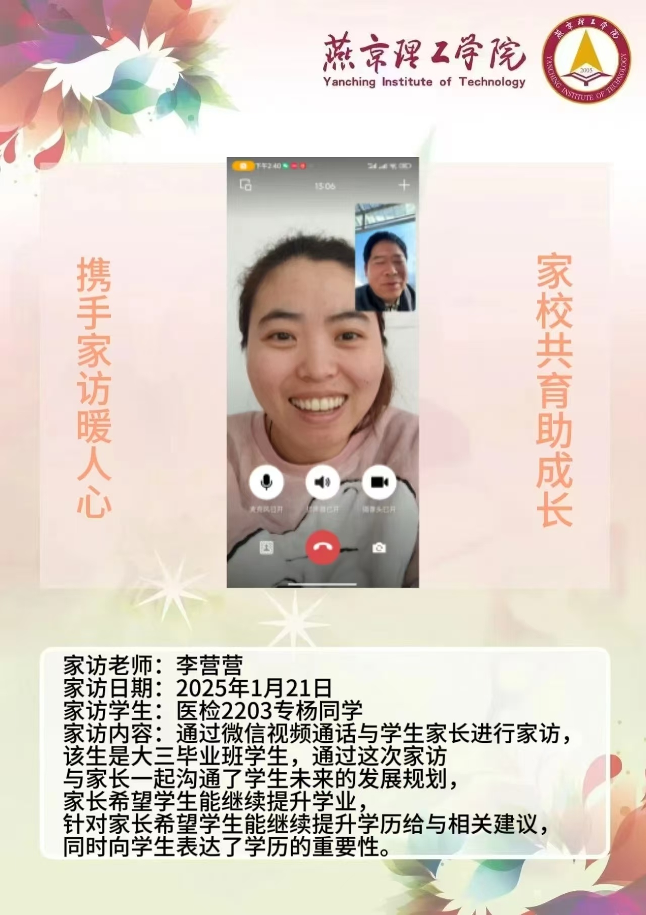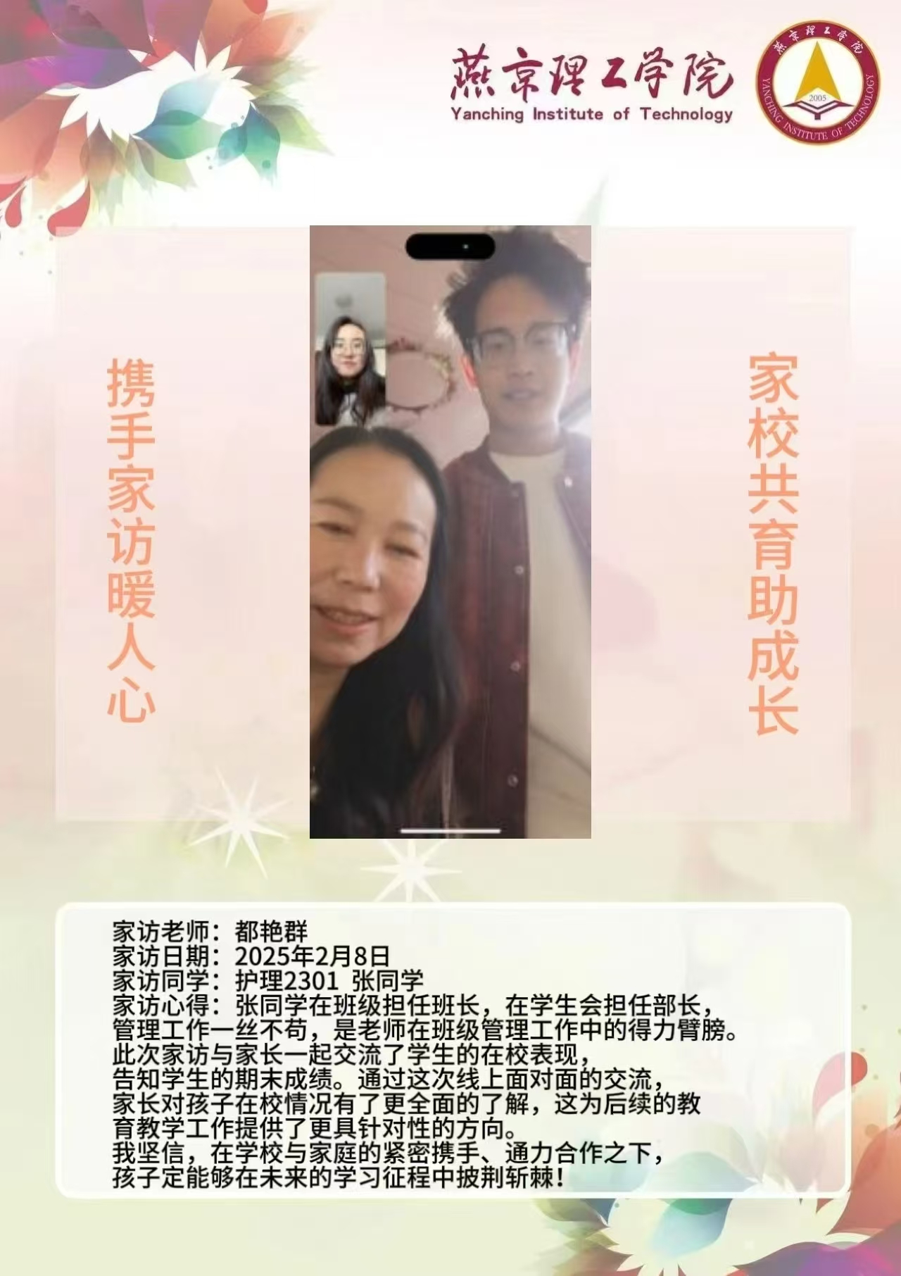 此次“大家访”活动是落实育人方针的关键举措,不仅搭建起家校沟通的稳固桥梁,更整合了校内外教育资源,构建起紧密联动的育人格局。未来,学院将持续深化家访成果,定期复盘经验,优化家访流程,确保家访工作常态化、高效化开展。同时,进一步挖掘家庭与社会资源,创新家校共育活动形式,打造更为完善的育人体系,全方位提升人才培养质量,为学生成长成才筑牢根基,在契合教育发展新形势的道路上稳步前行,培养出更多适应时代需求的优秀人才。