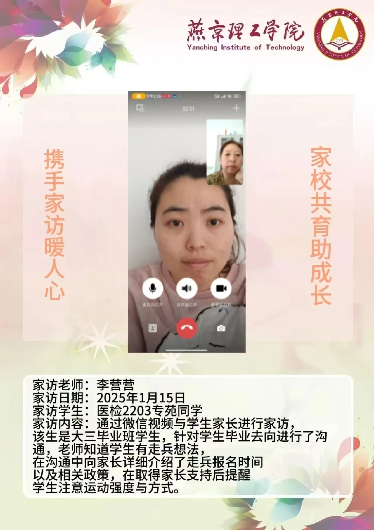 为深入贯彻全员育人、全过程育人、全方位育人的方针,切实提升人才培养质量,搭建学校与家庭之间稳固的沟通桥梁,整合校内外教育资源,形成紧密联动的育人格局,契合教育发展新形势与学校人才培育实际需求,环境与健康学院开展2025年寒假“携手家访暖人心 家校共育助成长”主题活动。