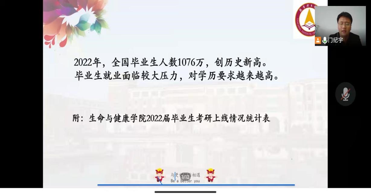 生命与健康学院门纪宇书记就班级的管理和国际化培养方面与班长们面对面交流。会上,门书记对生命与健康学院今年的国内考研率进行了深度分析,并为学生阐述了学历提升的重要性。